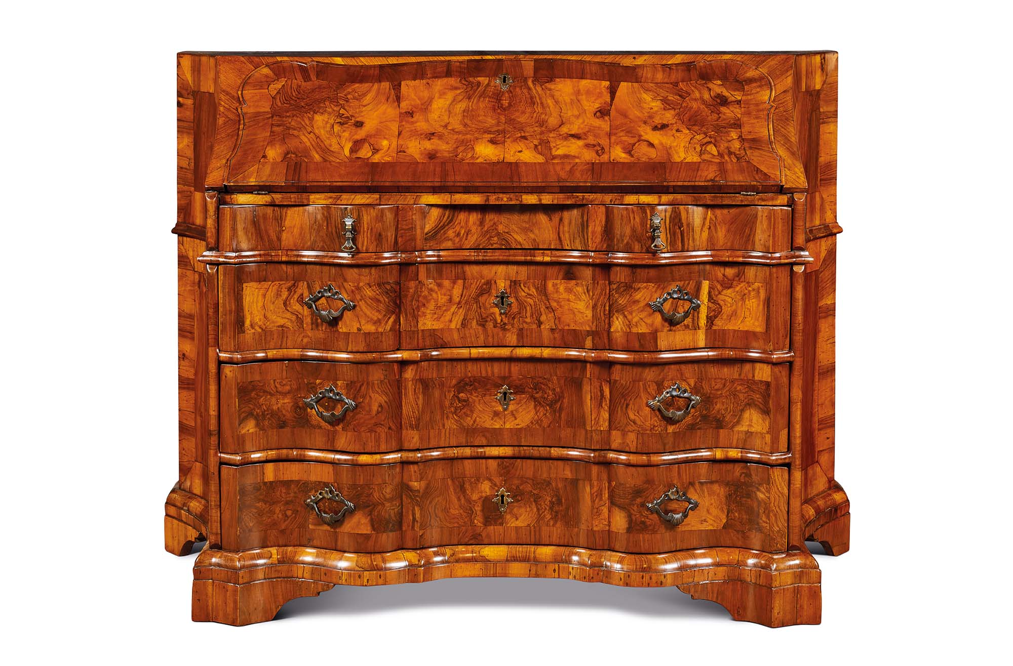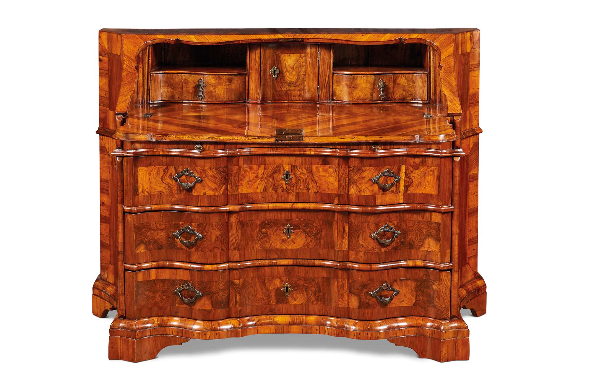 Il bureau, realizzato in legno e radica di noce, è valorizzato dall’andamento mosso dei fianchi e dalle morbide curvature del fronte elegantemente centinato, ripartito in tre ampi cassetti e in un quarto superiore di minor altezza, funzionale all’appoggio della calatoia, contraddistinta da una sagomatura vivace. La ribalta cela un interno organizzato in due cassetti laterali con sovrastanti due vani a giorno e un’antina centrale. Il bureau poggia su sostegni a mensola raccordati ad un duttile e ondulante cornicione.