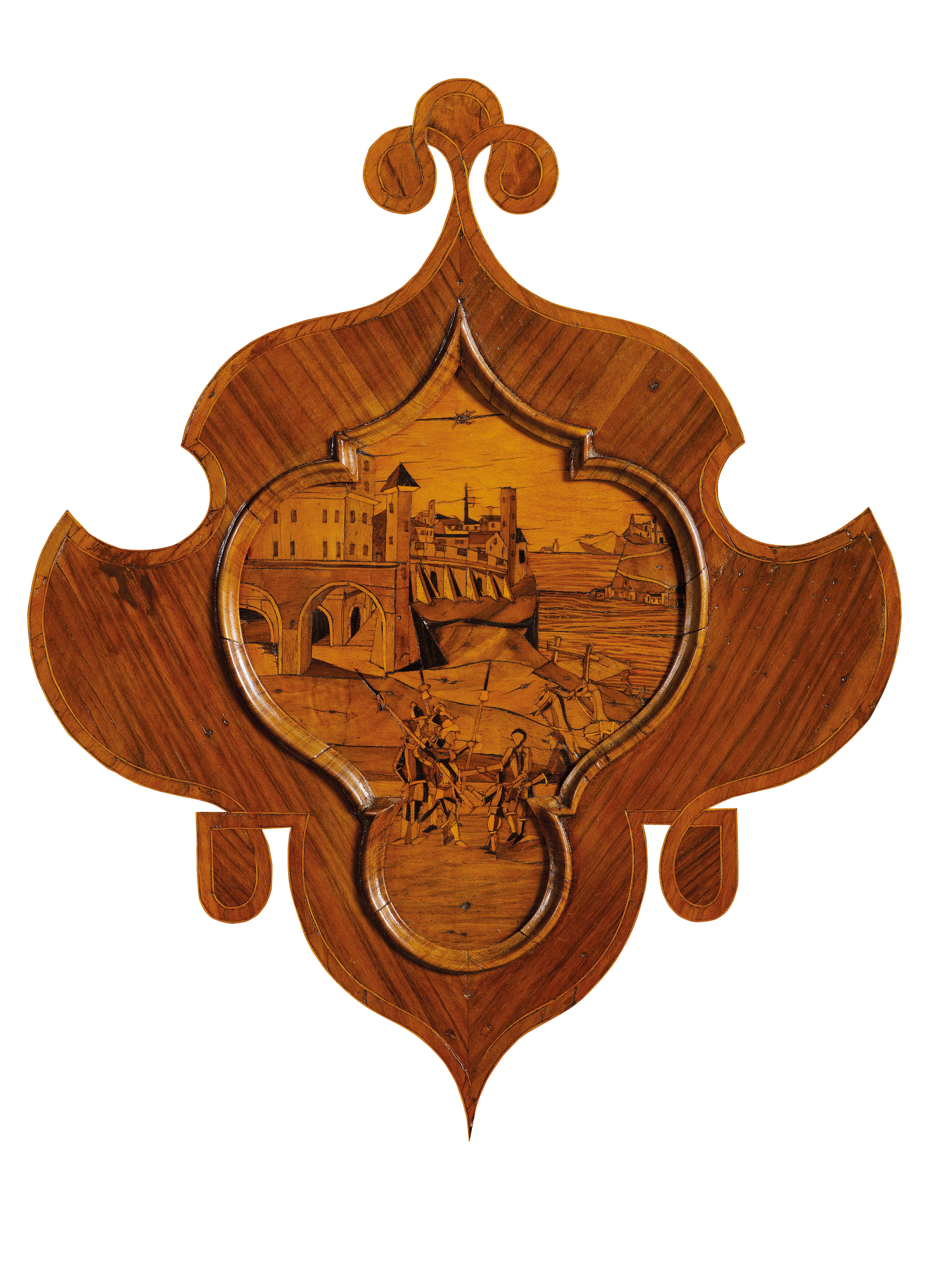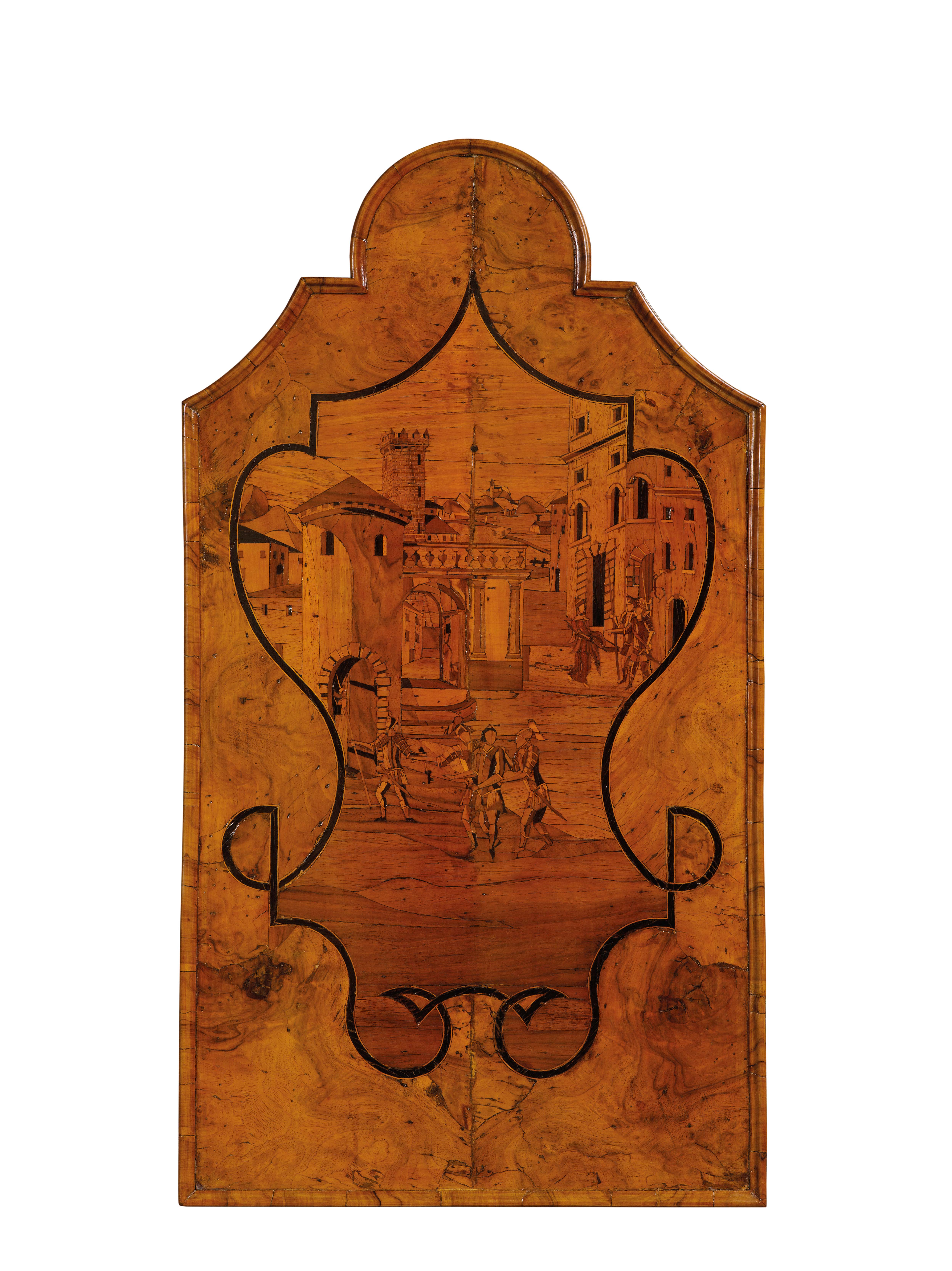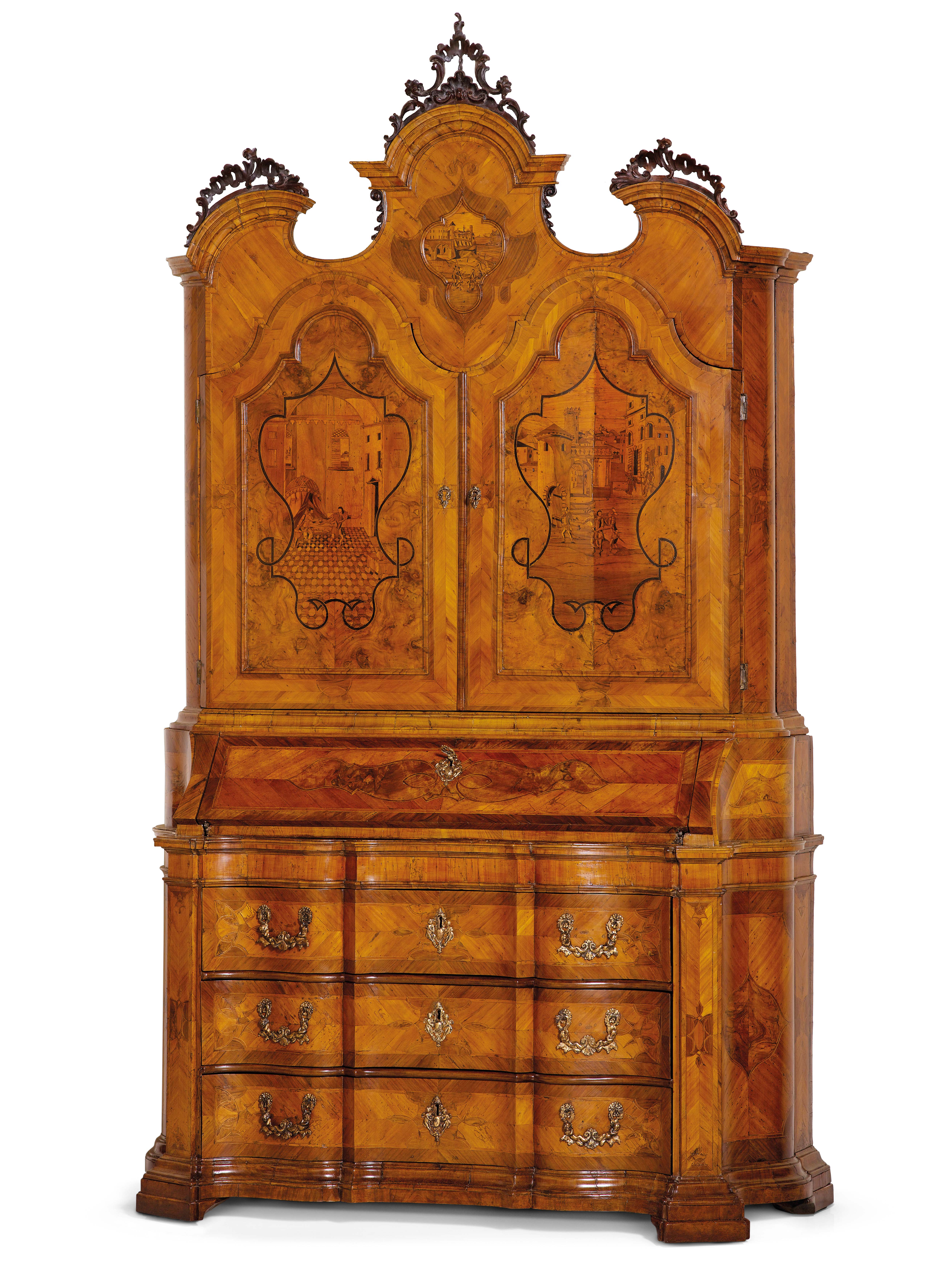 Di straordinario equilibrio compositivo, l'arredo a doppio corpo è realizzato in noce e radica di noce. La sua raffinatezza cromatica è accesa da preziose essenze lignee quali il ciliegio el'acero, con l'ulivo adoperato per le cornici di testa. Il corpo inferiore è scandito da tre ordini di cassettoni, impreziositi da specchiature disposte a spina di pesce, incorniciate da una bordura misurata ed elegante. Una calatoia centrale, ornata da una riserva in radica, cela al suo interno un comparto di quattro cassettini, un’antina e il consueto vano segreto. Il corpo superiore si articola in due ante, con vertici sagomati, decorate da specchiature in radica di noce e riserve dai profili in ebano, al cui interno si stagliano raffinate tarsie raffiguranti vedute prospettiche e vivaci figurine. Il timpano spezzato, energicamente modanato, accoglie al centro una veduta prospettica contenuta in una riserva sagomata, mentre al vertice si eleva un fastigio, animato da motivi di volute, fiori e rocailles. L’arredo poggia su sostegni a mensola sagomati, raccordati a un cornicione mosso.