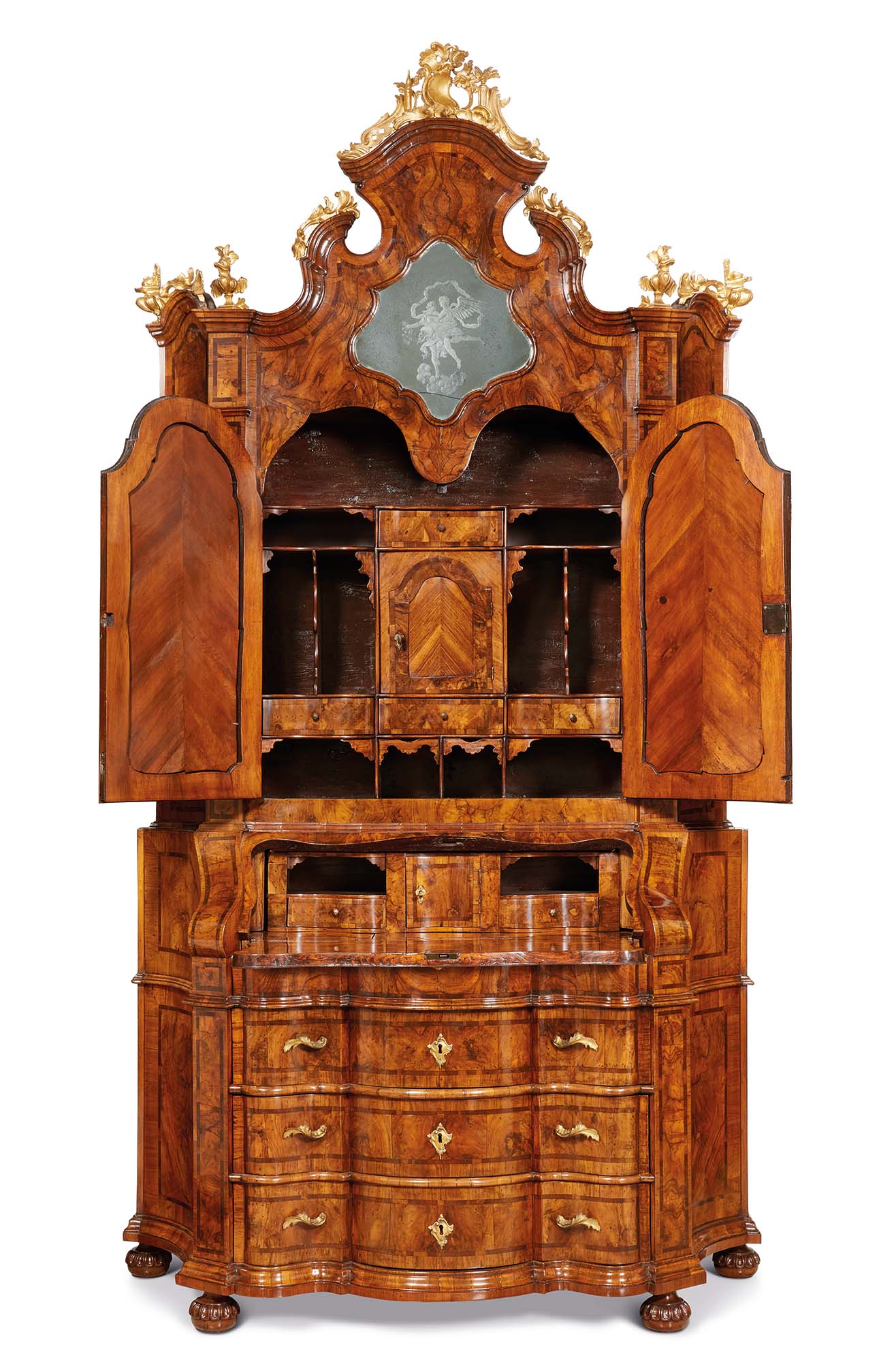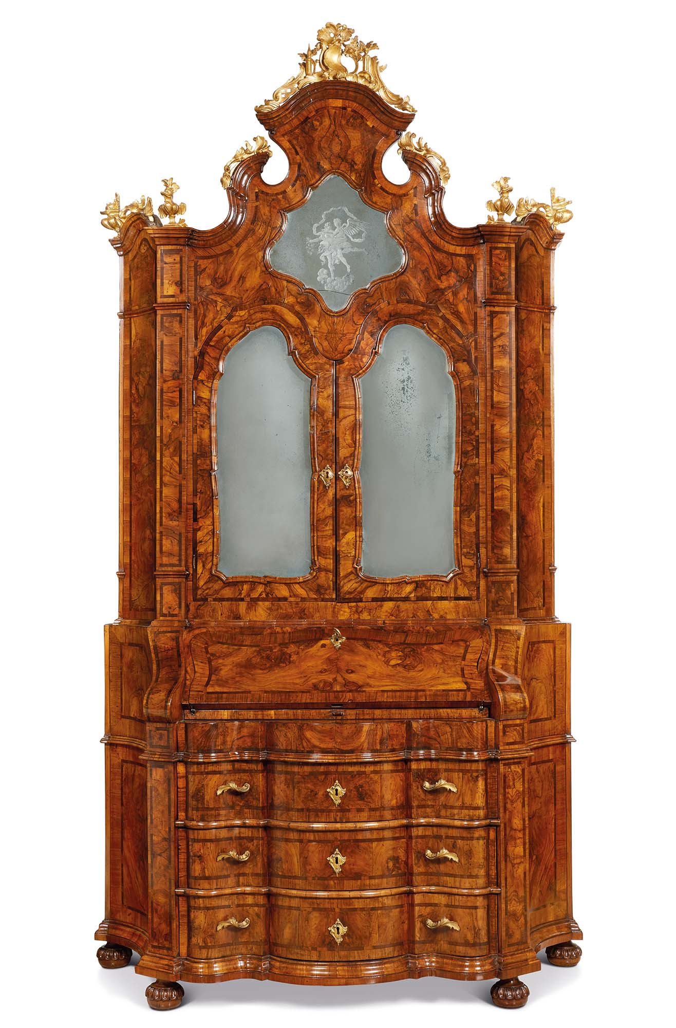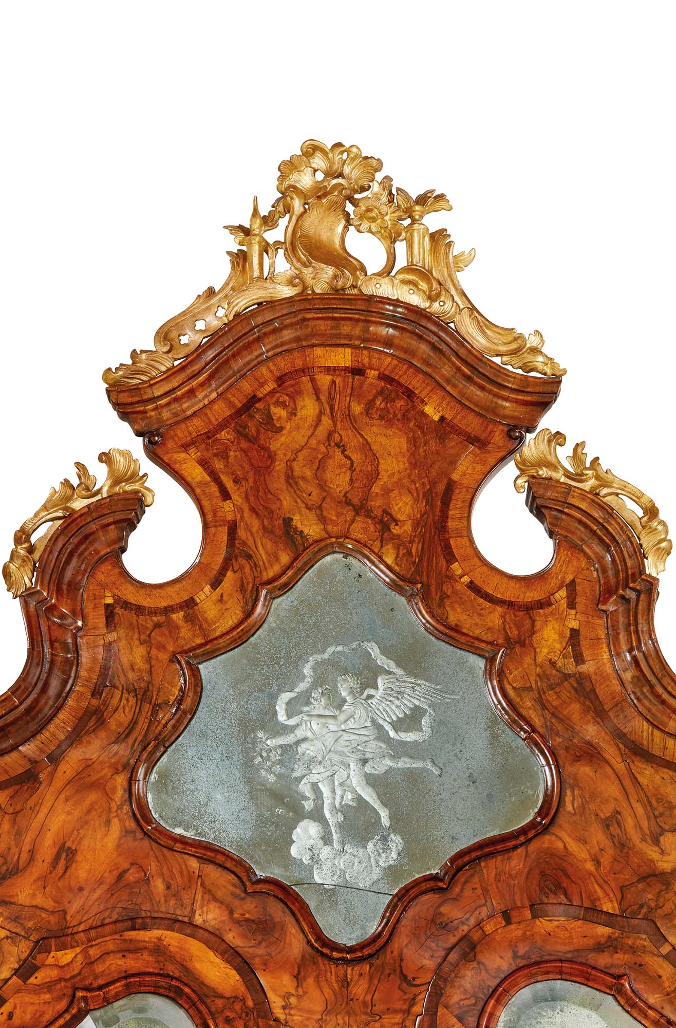 Il trumeau, di presenza solenne ma calibrata ed armoniosa, si distingue per l’abile impiego della luminosa radica di noce e per la sapiente articolazione di volumi arrotondati e precisi. La sommità è impreziosita da una superba cimasa con timpano spezzato, caratterizzata da pinnacoli in legno scolpito e dorato, tra cui si insinuano intagli fogliacei di acanto anch’essi dorati. Il corpo superiore si sviluppa attraverso due ante a specchio dai vertici dolcemente sagomati, che celano al loro interno una composizione ordinata di vani a giorno, minuti cassettini e un’antina centrale. La parte inferiore si articola in tre cassettoni, al di sopra dei quali una sottile fascia funge da base alla calatoia, dal profilo sagomato, che presenta una disposizione di due cassettini laterali, vani a giorno e una piccola antina. I fianchi, dal profilo ondulato e rientrante, si raccordano con garbo alle due spalle laterali, definite da paraste delicatamente sporgenti e arrotondate. I raffinati piedini a cipolla intagliati si innestano su un cornicione mosso, conferendo al trumeau una linea morbida e sinuosa.