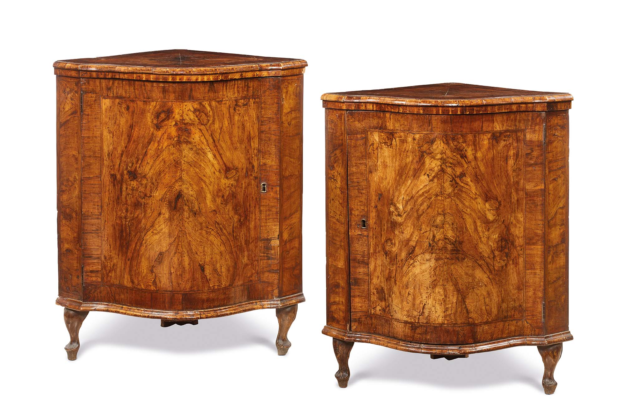 Le angoliere, dalle graziose forme, sono illuminate dall’equilibrato impiego della radica di noce che ne impreziosisce il piano angolare, le lineari paraste e il fronte bombato, caratterizzato da un’anta, all’interno della quale si celano tre ripiani sagomati. Il cornicione di base, sottile e raffinato, asseconda il movimento sinuoso dell’arredo, raccordandosi a brevi sostegni en cabriole, la cui terminazione richiama la foggia di un piede ferino.