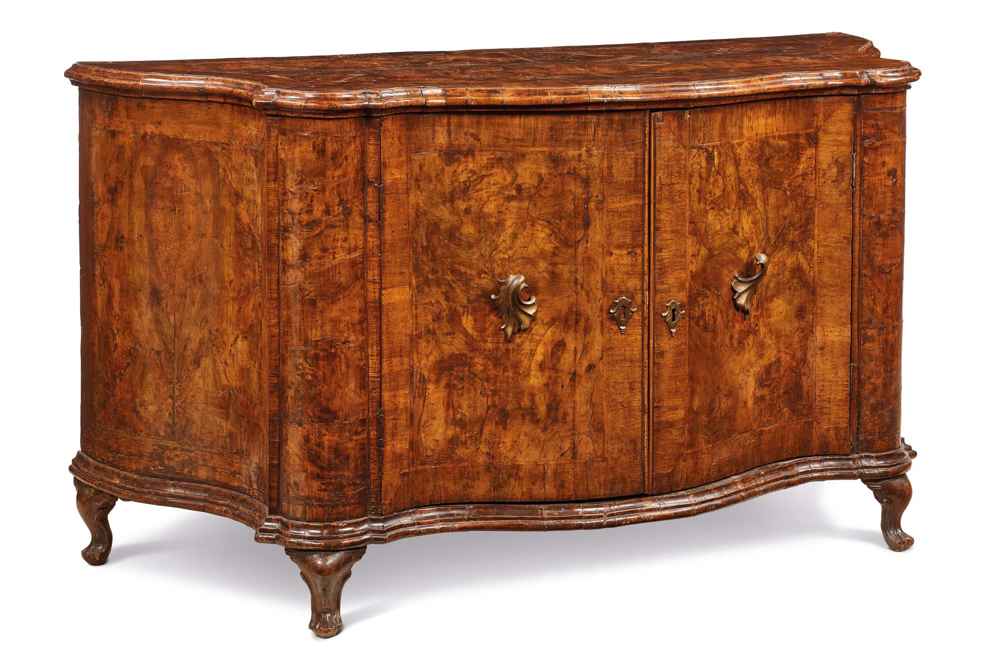 La credenza bombata si staglia per la sua presenza maestosa e l’armoniosa sinuosità delle sue linee equilibrate. Il fronte, scandito da due ante adiacenti, rivela le suggestive marezzature della radica di noce e si congiunge fluidamente ai fianchi tramite due paraste sporgenti. Il piano è finemente sagomato per replicare la doppia curvatura dei fianchi, graziosamente rientranti. Impreziosita da un cornicione di base scolpito, la credenza è sostenuta da quattro agili piedini en cabriole, le cui terminazioni assumono una foggia ferina.