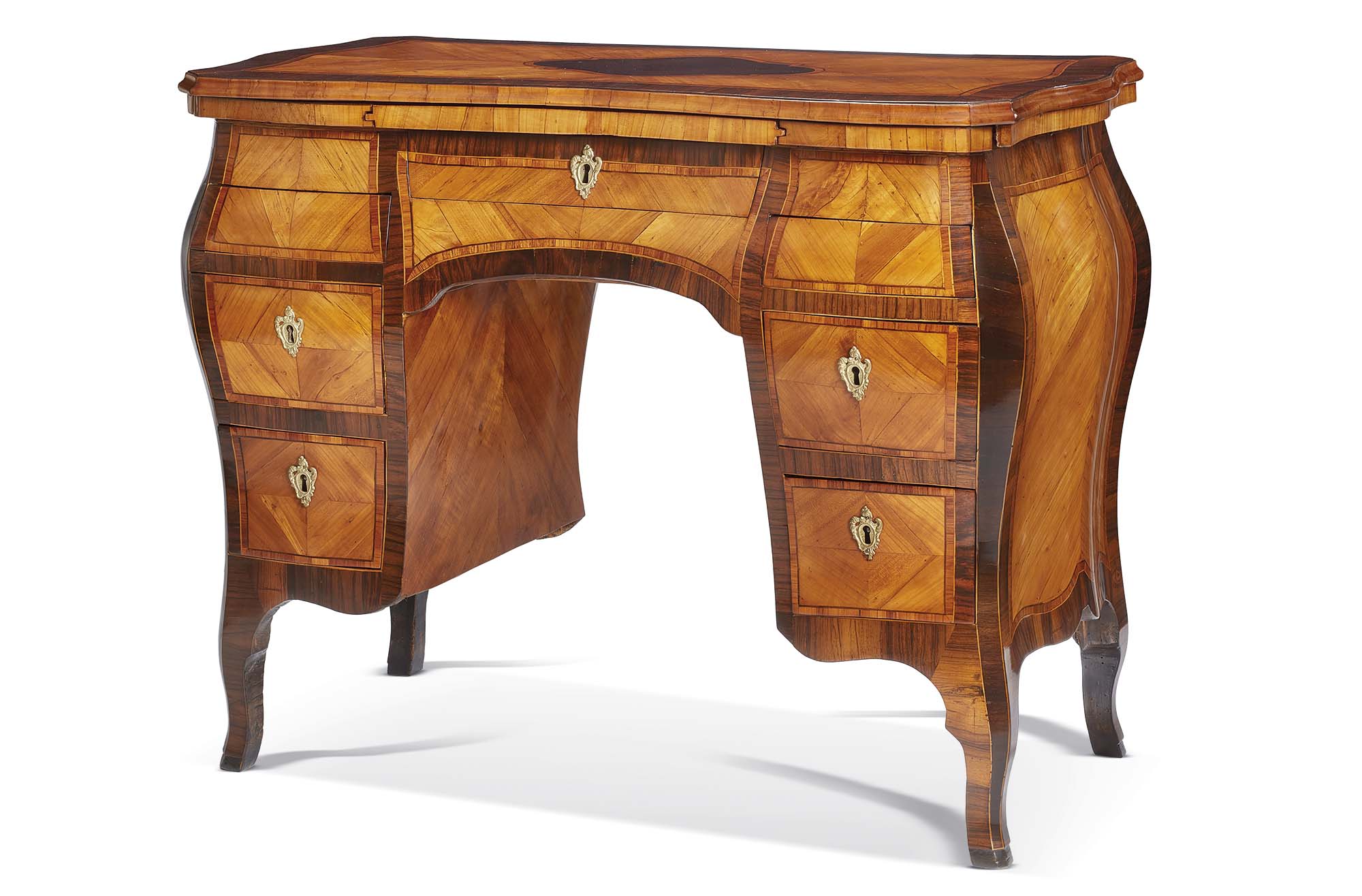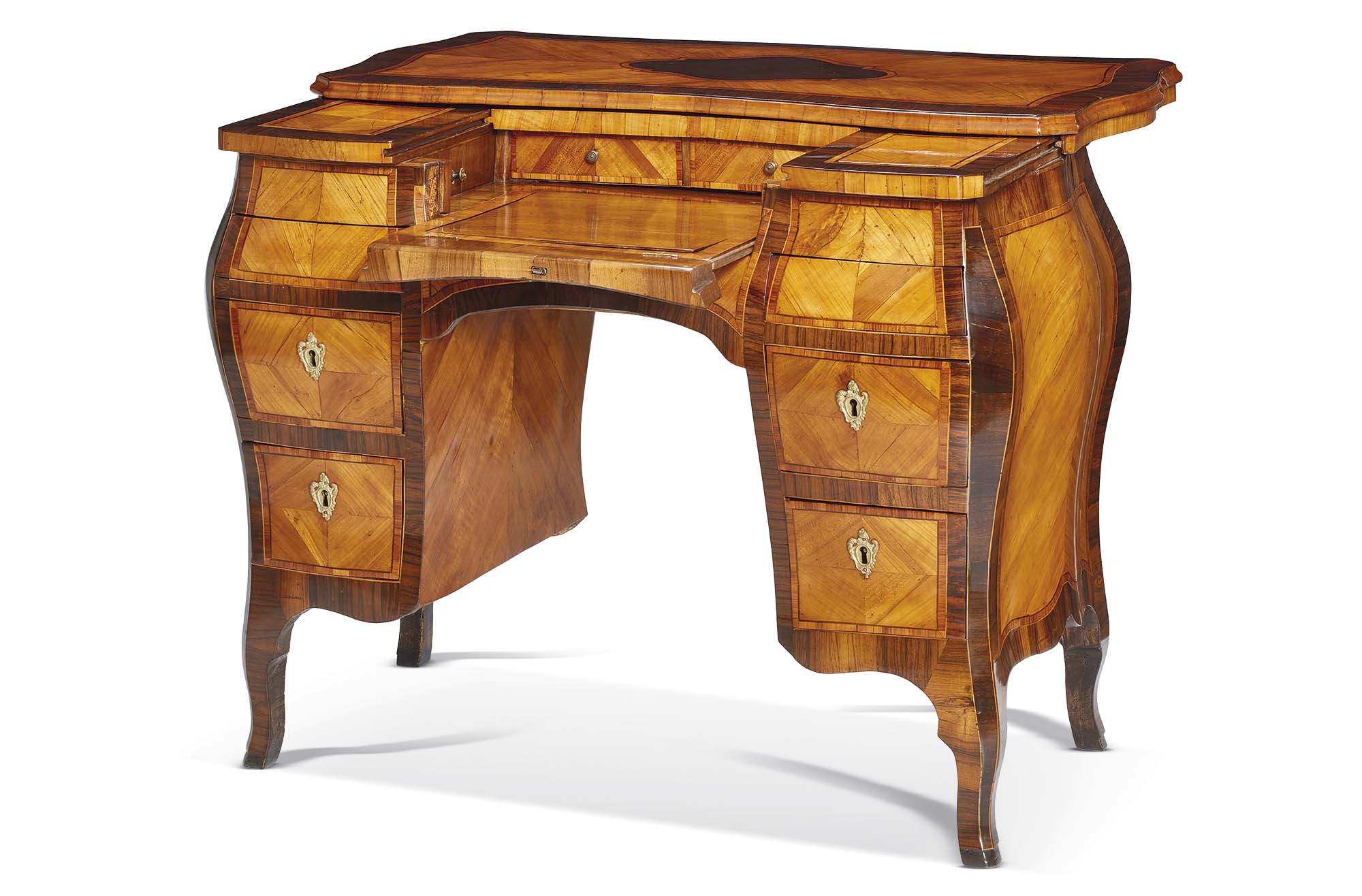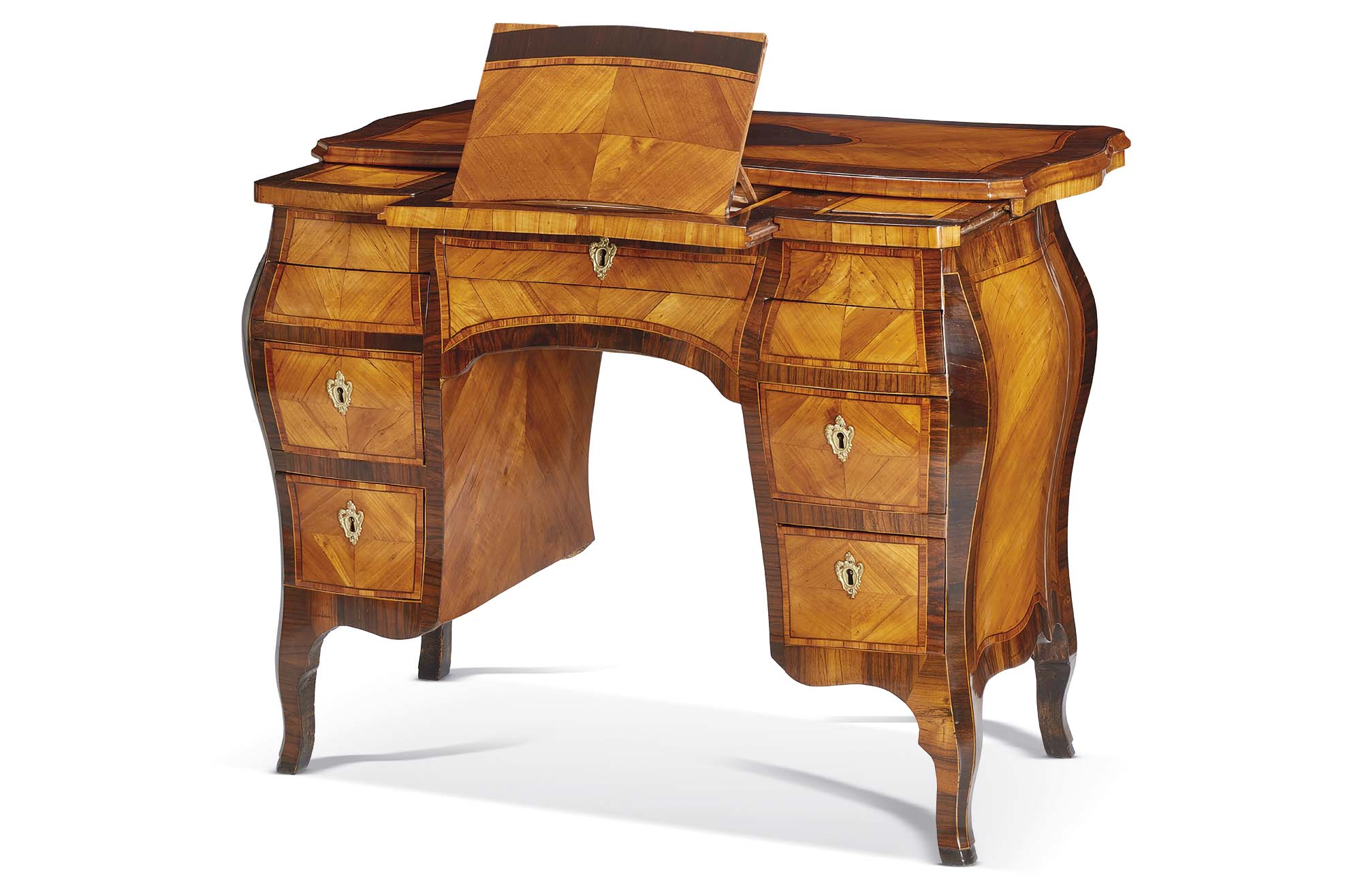 La scrivania da centro, di moderate e apprezzabili dimensioni, è impiallacciata in legno giallo di Portogallo e legno di palissandro con filettature in bois de rosa e bois de viola, che ne descrivono il decoro. Il fronte è dotato di due ordini di cassetti laterali e una fascia sottopiano con altri tre cassetti. Il piano scorrevole cela un leggio, vani, cassettini e segreti. La scrivania poggia su eleganti gambe arcuate, direttamente collegate alle lesene sporgenti. In questo momento finale dello stile Luigi XV, la perspicace manifattura veneziana ricalca felicemente la fiorente maniera e le affermate linee proprie dello stile francese, ideando così forme bombate ma contenute e impiegando pregiate essenze lignee non autoctone, dalle tinte calde ed esotiche.