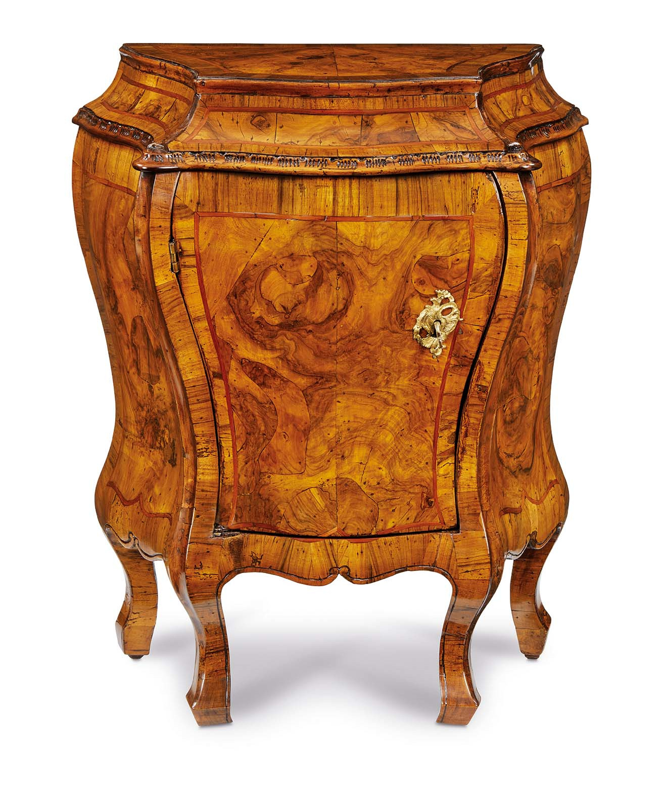 Notevoli specchiature in radica di noce, arginate da filettature in legno di paduk e da impiallacciature in legno di noce, descrivono le superfici del mobiletto a urna dalle forme bombate e ricercate. Lo strepitoso avvicendarsi di curve e controcurve è assecondato dal piano sagomato e dalla tradizionale gola incava, che ricalca soluzioni di matrice olandese. Il fronte è scandito da un’anta e rifinito da una centinatura a cui si innestano direttamente i brevi sostegni en cabriole.