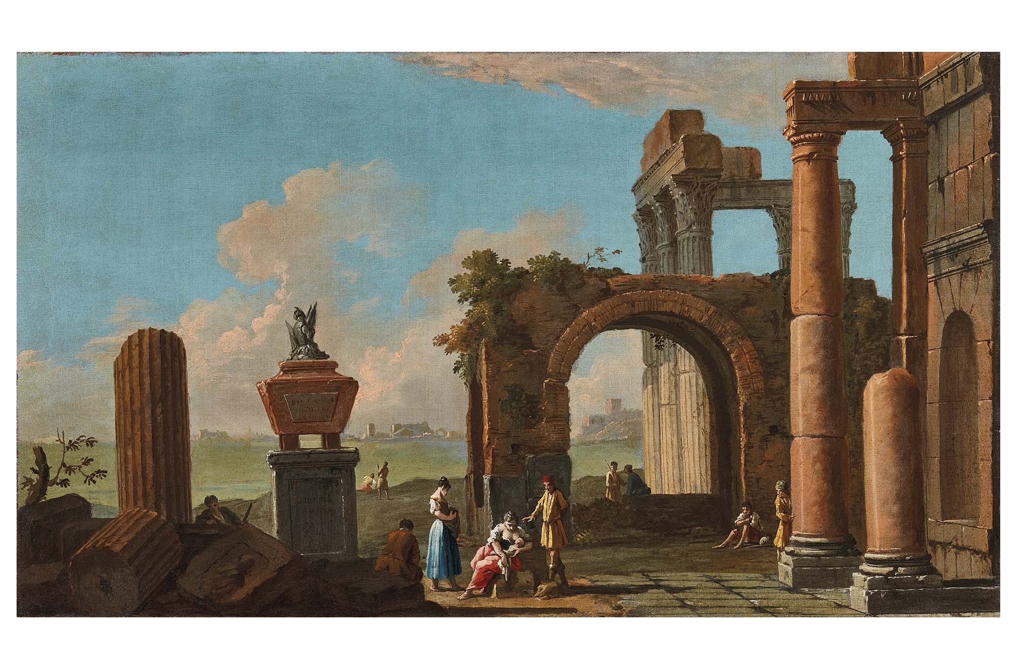 Veduta lagunare ideata con rovine classiche e figure