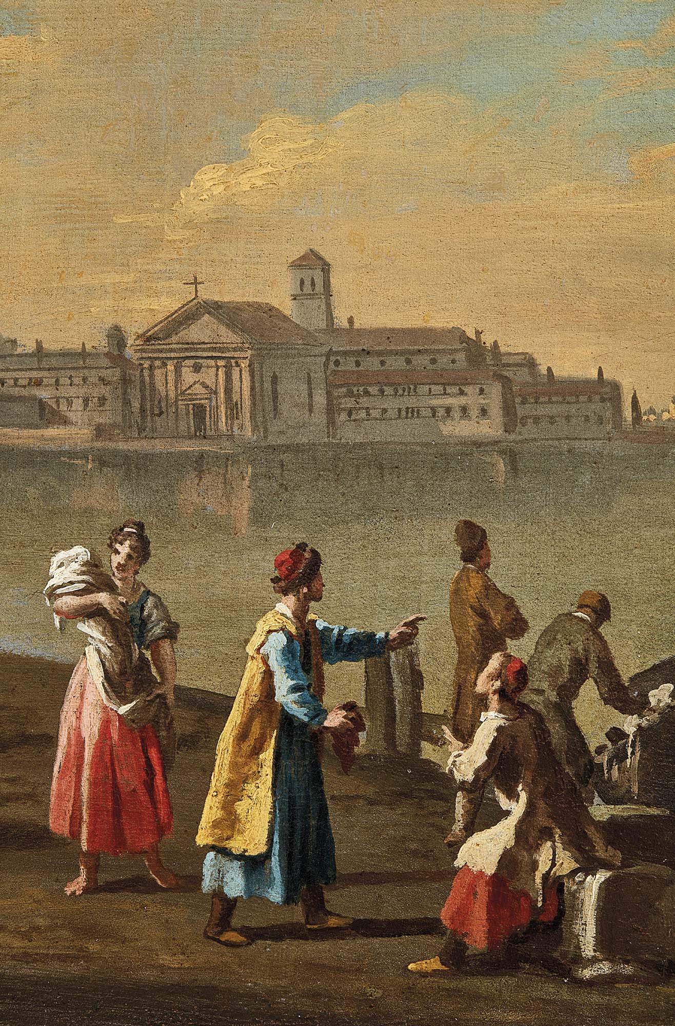 freschezza momenti di vita quotidiana e accentuano lo stacco prospettico del piano. Come spesso accade nelle vedute dell’artista, il colore svolge un ruolo fondamentale, infondendo nei personaggi un vivace dinamismo e una particolare vitalità cromatica. Databile alla piena maturità di Johan Anton Richter, verso la fine degli anni trenta, l’inedita coppia di vedute ideate restituisce con deliziosa freschezza l’ineguagliabile atmosfera della laguna veneziana: un sogno sospeso nel silenzio tra cielo e mare.