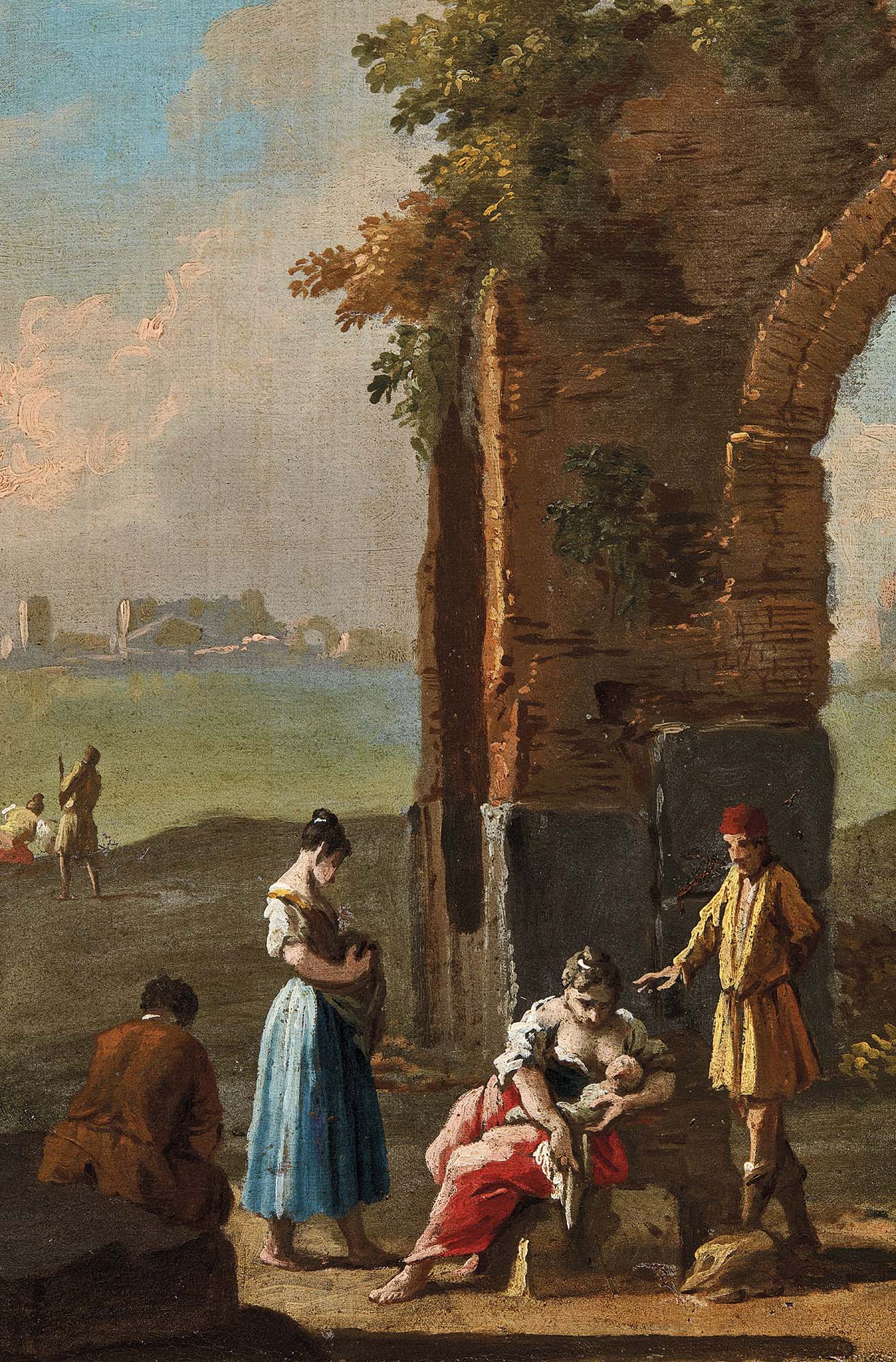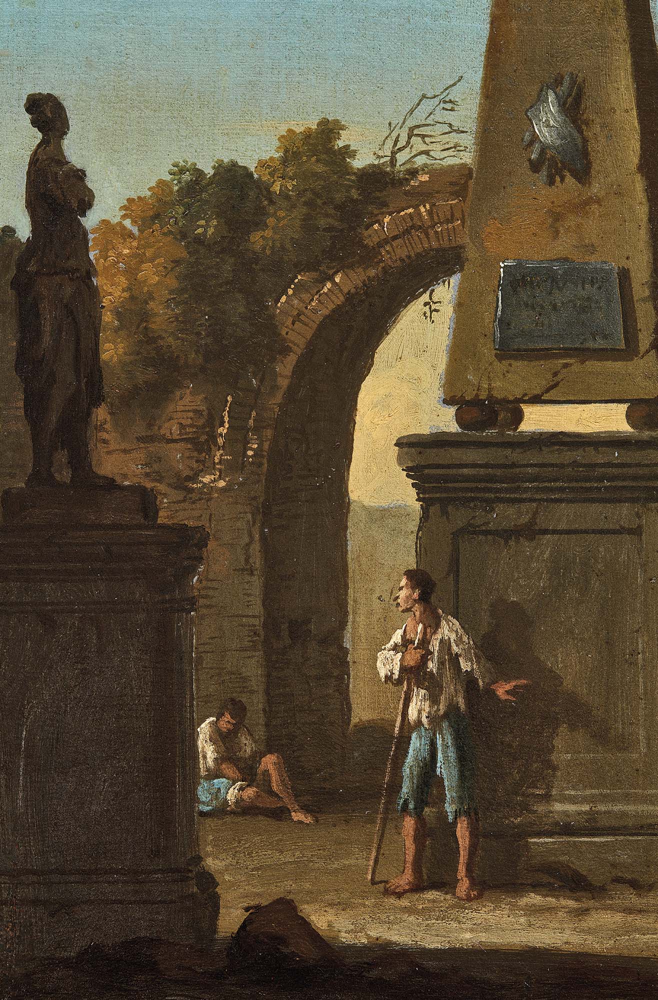 Originario della città di Stoccolma, dove nasce nel 1665, figlio di un orefice e fratello del miniaturista David, Johan Anton Richter viene educato in patria dal decoratore e miniatore Johan Sylvius. Nel 1697 lascia la Svezia e parte per l’Italia, giungendo anche a Venezia, dove la sua presenza è documentata dal 1710 fino alla sua morte, nel 1745. L’attività del pittore svedese si svolge tra la piena maturità del vedutista Luca Carlevarijs, del quale diviene allievo e collaboratore, e il sorgere dell’astro di Giovanni Antonio Canal, detto il Canaletto, riuscendo a conquistarsi un posto di rilievo nelle collezioni locali e in quelle degli stranieri di passaggio a Venezia. Il vedutismo del pittore svedese è caratterizzato da un’impostazione prospettica rigorosa e nitida e da un colore chiaro e luminoso – elementi desunti dalla maniera di Carlevarijs, ma resi personali da un certo estro nelle macchiette. Pur concependo la veduta come strumento di evocazione di un luogo famoso, l’artista rivela un interesse particolare per la realtà quotidiana e le scenette vivaci, talvolta inserite in un ambiente architettonico di fantasiosa invenzione e fiabesca bellezza. In Veduta lagunare ideata con arco romano in rovina e obelisco l’acqua della laguna separa il primo piano da un isolotto, dal quale si affacciano una chiesa e alcuni edifici. L’obelisco e la colonna spezzano l’orizzontalità dell’opera, mentre i popolani sono variamente atteggiati e splendidamente resi nella verità degli abiti modesti, toccati con pennellate sostanziose che si affinano maggiormente nella descrizione dei volti. In Veduta lagunare ideata con rovine classiche e figure l’impostazione scenografica è più marcata, costruita attraverso l’edificio in rovina sulla destra, il grande arco e il colonnato antico. Le grandi figure in primo piano, proposte in diverse movenze, restituiscono con notevole