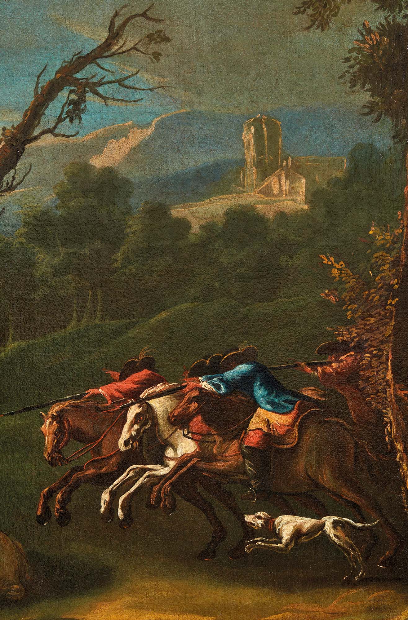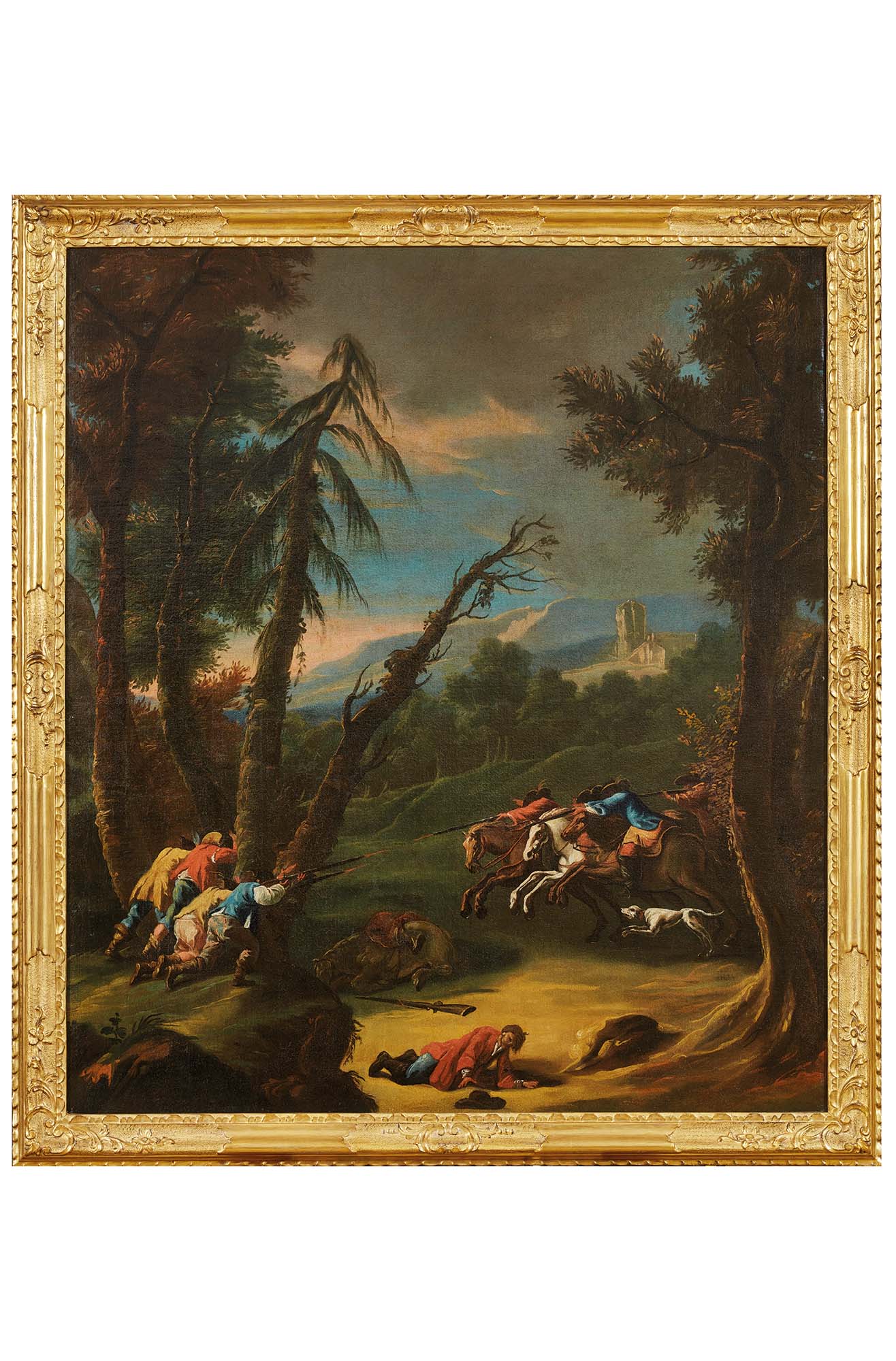 Nell’impetuoso ed energico Assalto dei briganti, Gaspare Diziani si misura con una delle tematiche più avvincenti e scenografiche della pittura settecentesca: lo scontro armato tra bande di malviventi e pattuglie militari, consumato in scenari impervi e solitari. L’opera si inserisce in un filone iconografico alimentato da episodi di aggressioni e rapine realmente accaduti e trova un'eco importante nella pittura europea del tempo, affrontato con accenti analoghi da maestri come Salvator Rosa, Francesco Simonini, Marco Ricci. È tanto più degno di nota osservare come questo soggetto – che Diziani trattò con convinzione e varietà – risulti pressoché assente nella pur autorevole monografia redatta da Anna Paola Zugni Tauro, così come in altri da studi specialistici. Eppure, l’artista bellunese affrontò più volte scene d’assalto e banditismo, contribuendo con esiti originali a un genere pittorico teso, drammatico e carico di energia visiva. Si tratta di un tema che affonda le radici nei resoconti realistici di aggressioni e assalti durante gli spostamenti dei viaggiatori, ma che si fa, sulla tela, racconto epico e macchina teatrale. La composizione si sviluppa in un’insolita impostazione verticale, che amplifica la tensione ascensionale dello scontro e consente di articolare la scena in più livelli dilettura. Il fulcro visivo dell’opera è costituito dallo scontro tra le due fazioni: a sinistra, un drappello di soldati avanza sparando verso una formazione caotica e irruente di briganti a cavallo, che sopraggiungono dalla destra. Le posture concitate dei cavalli, i panneggi agitati, l’impeto sfrenato dei personaggi scomposti e tumultuosi conferiscono all’immagine un effetto di dramma congelato, come un fermo immagine di un teatro d’azione. La tavolozza cromatica calda e pulsante, con predominanza di toni ocra, rossi laccati, bruni dorati everdi cupi, è tipica della maturità di Diziani. La luce filtra tra gli alberi come un riflettore teatrale, creando contrasti drammatici e giochi chiaroscurali che enfatizzano il senso di pericolo imminente. I tratti sono rapidi, energici, impulsivi, in linea con la pennellata di getto che contraddistingue le sue opere più mature. Sebbene noto soprattutto per le pale d’altare e i cicli decorativi a tema religioso e mitologico, Gaspare Diziani mostrò sempre una predilizione costante per i soggetti d’azione, che gli permettevano di esprimere la sua vivacità inventiva, l’ardore della pennellata e nei quali poteva sperimentare soluzioni sceniche ardite. Affrontò il tema dell’assalto dei briganti in numerose varianti, spesso in collaborazione con il figlio Antonio, raffinato interprete di paesaggi e vedute. Anche questo dipinto lascia intuire un’esecuzione congiunta: la resa più larga e sintetica delle quinte arboree, la semplificazione dei piani prospettici el’ampia stesura delle masse cromatiche fanno supporre l’intervento di Antonio Diziani nella definizione del fondale naturale, mentre la regia figurativa e la gestualità delle scene centrali tradiscono la mano esperta di Gaspare. Una sinergia perfettamente equilibrata tra invenzione e scenografia, tra gesto e ambiente. Ingegnoso nelle composizioni complesse, rapido e incisivo nei bozzetti, brillante nel disegno e capace di grazia tenera nelle sue raffigurazioni angeliche, Gaspare ha saputo dare forma a una pittura sempre vitale, di forte impatto scenico ed emotivo. Secondo solo a Sebastiano Ricci e al monumentale Tiepolo, fu nel panorama delle scuole italiane coeve, tra i più autorevoli e ispirati interpreti della pittura decorativa e narrativa del suo tempo. Opere come Assalto ai briganti non rappresentano soltanto una digressione tematica, ma costituiscono un manifesto della sua energia creativa: un felice equilibrio tra forza narrativa, invenzione pittorica e maestria tecnica, in cui il gesto diventa linguaggio e la scena si fa teatro della pittura.