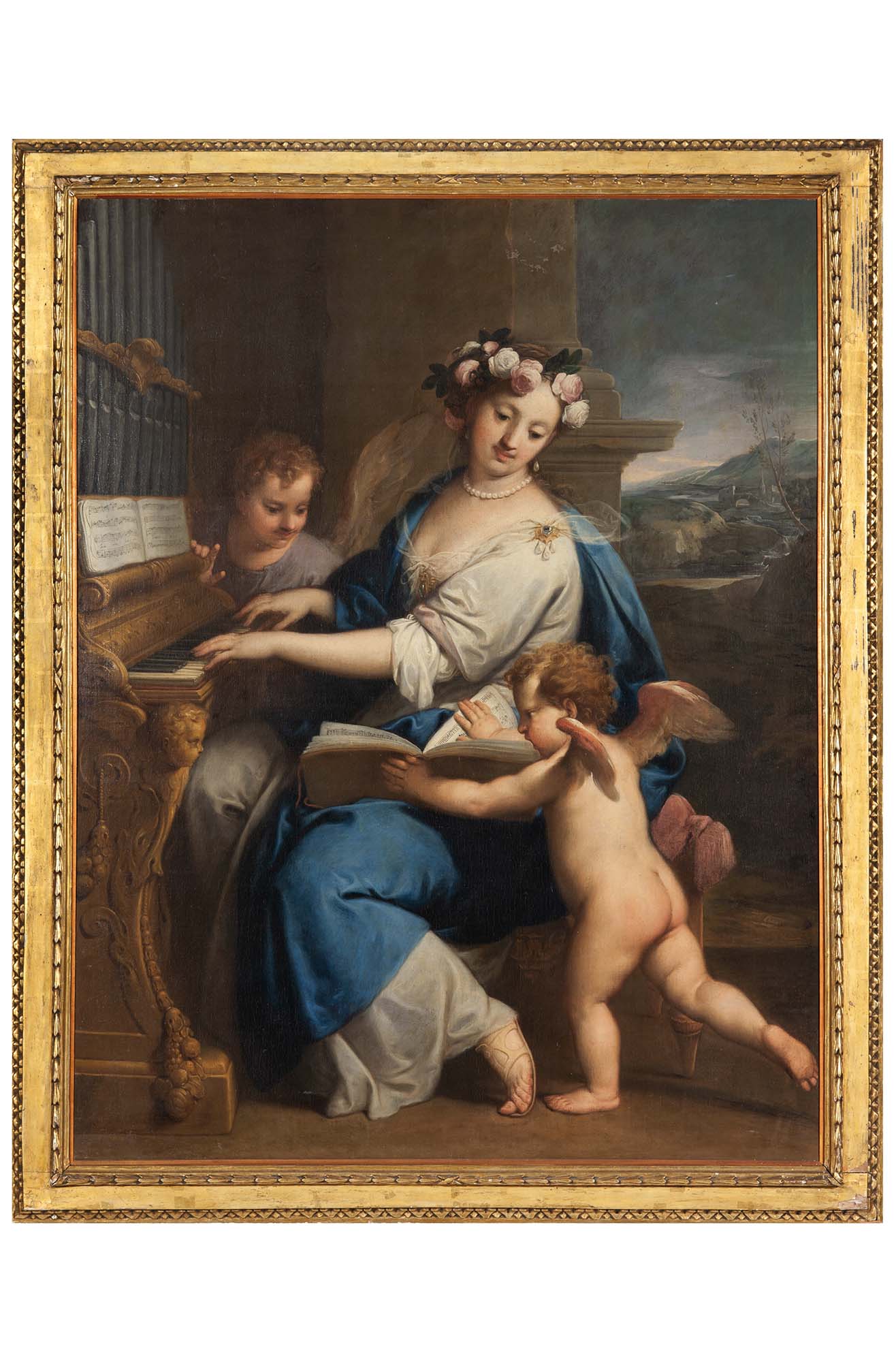 Tra le trame luminose della pittura veneziana a cavallo fra Seicento e Settecento, si distingue la cifra colta e composta di Gregorio Lazzarini, autore di quest’opera, che coniuga armoniosamente decoro formale, grazia narrativa e intensità devozionale. Nato a Venezia nel 1665 e morto a Villabona Veronese nel 1730, la sua formazione avvenne nella bottega del genovese Saverio Rosa, attivo in laguna intorno al 1670, ma fu sotto l’influsso della pittura meditativa e calibrata di Girolamo Forabosco che Lazzarini andò delineando quella cifra stilistica che gli fu poi riconosciuta dal biografo Vincenzo da Canal (1732): un “gusto per una stesura levigata e ferma del colore, articolato in una definizione disegnativa”, sintesi perfetta di equilibrio plastico e finezza intellettuale. Questa sua adesione a un linguaggio pittorico di sobria eleganza, che rifuggiva tanto dalle tensioni drammatiche e caravaggesche quanto dalla leziosità del Barocchetto incipiente, lo avvicinò agli stilemi di Carlo Cignani e Marcantonio Franceschini, punti di riferimento per un’intera generazione di pittori dell’Italia settentrionale. L’opera di Lazzarini si colloca così in un ambito culturale improntato a un accademismo nobile e sorvegliato, il cui rigore non soffoca, ma anzi esalta, la narrazione sacra e la resa psicologica dei personaggi (1). Fra i suoi meriti va ricordata anche la formazione del giovane Giambattista Tiepolo, il quale, pur partendo da quell’educazione misurata e classicheggiante, presto ne superò i limiti orientandosi verso esiti più scenografici e luministici, sotto l’influenza di Giambattista Piazzetta. Il soggetto rappresentato è Santa Cecilia, figura di straordinario fascino nella devozione cristiana e nella storia dell’iconografia sacra. Vissuta tra il II e il III secolo d.C. in una Roma ancora ostile al cristianesimo, Cecilia apparteneva a una nobile famiglia patrizia e, fin dall’adolescenza, si distinse per una profonda inclinazione spirituale. Consacrata a Dio con voto di verginità, venne nondimeno data in sposa al giovane pagano Valeriano. La notte delle nozze la santa rivelò al marito la sua consacrazione e la presenza di un angelo custode a difesa della sua purezza. Colpito da tale rivelazione, Valeriano si convertì, ricevette il battesimo da Papa Urbano I e, poco dopo, fu seguito dal fratello Tiburzio. I due si distinsero per atti di pietà cristiana, in particolare la sepoltura dei martiri, gesto vietato dalle leggi imperiali, e furono per questo arrestati e condannati al martirio. Cecilia, rimasta sola, proseguì instancabilmente la sua opera di evangelizzazione, sostenendo la comunità cristiana con parole e opere. Anch’ella venne infine arrestata. La sua condanna fu crudele e articolata: prima si tentò di ucciderla per asfissia in un bagno di vapore, ma ne uscì miracolosamente illesa. Fu quindi destinata alla decapitazione: il boia le inflisse i tre colpi previsti dalla legge, ma la giovane non morì all’istante. Sopravvisse per tre giorni, durante i quali – secondo la tradizione – non cessò mai di pregare, esortare i fedeli e distribuire i propri beni ai poveri. La morte la colse con le mani disposte in un gesto simbolico della Trinità: tre dita della mano destra sollevate, un dito della sinistra teso a indicare l’unità delle tre Persone divine. Il suo corpo fu sepolto nelle catacombe di San Callisto e nel 1599 fu ritrovato incorrotto, adagiato nella posizione stessa in cui era spirata, come se dormisse nella pace di Dio. Santa Cecilia è venerata come patrona della musica. La tradizione racconta che, mentre si avviava al martirio, cantasse a Dio nel suo cuore, testimoniando una fede armoniosa e profonda, capace di trasformare la sofferenza in lode. Per questo motivo è spesso rappresentata con strumenti musicali, in particolare l’organo, simbolo della sua anima elevata verso il Cielo. Nel dipinto Santa Cecilia suona l’organo, la vergine incoronata di rose, è raffigurata in atto di suonare contornata da due angeli, di cui uno sorregge lo spartito musicale. L’apertura paesaggistica sulla destra, con il suo respiro arioso, contribuisce ad amplificare la grazia della composizione, che ruota attorno alla figura centrale: una donna giovane e solenne, avvolta in un morbido manto azzurro che fascia una tunica bianca ornata da spillegemmate. La ricchezza cromatica, vivace e fresca, si accompagna a una stesura pittorica liscia e controllata, che riflette in pieno il linguaggio controllato e raffinato del maestro. Databile agli ultimi anni del Seicento, l’opera costituisce un esempio emblematico della poetica di Gregorio Lazzarini, improntata a un classicismo temperato e alla cura del disegno, elementi che segnarono una tappa fondamentale nel percorso della pittura veneziana pre-tiepolesca.
