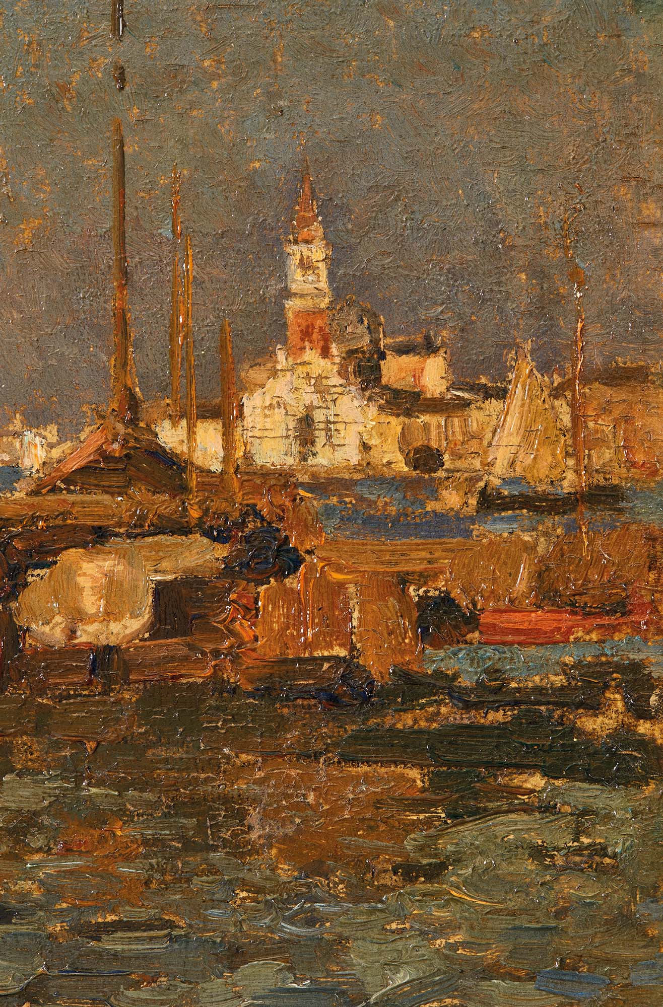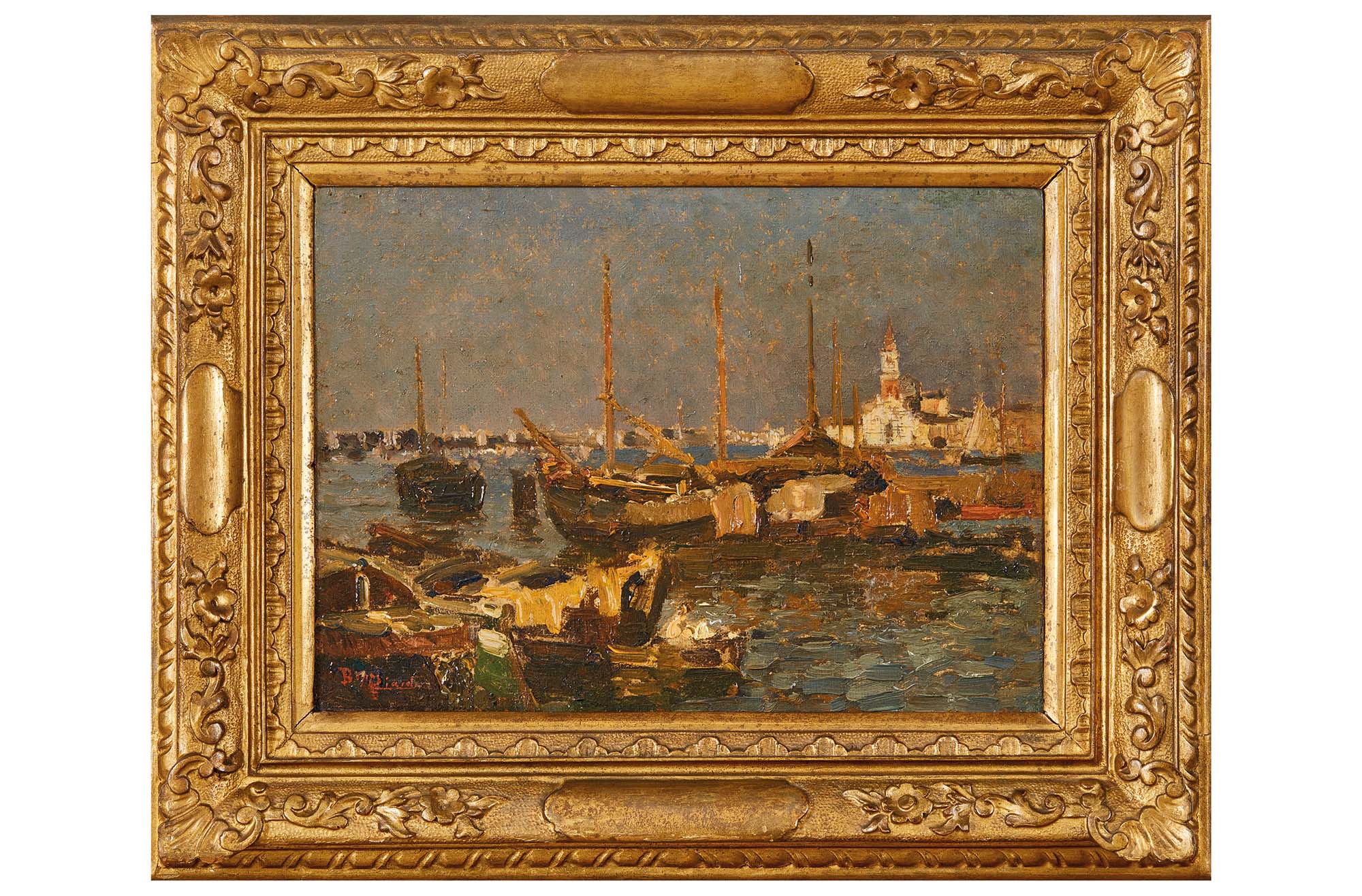 L’opera, attribuibile alla mano del maestro Beppe Ciardi, cattura con sensibilità l’atmosfera eterea della laguna, collocandosi idealmente nel filone di una tradizione pittorica che ha saputo fondere l’osservazione del vero con una personale e profonda interpretazione lirica della realtà. Sebbene di dimensioni contenute, la tela si dispiega in una composizione di ampio respiro, dove il cielo e l’acqua occupano una parte preponderante della scena, intessendo un dialogo di particolari riflessi e cromatismi, che Beppe Ciardi modella con rapide e dense pennellate, creando volumi di nuvole e spaccati di onde. L’acqua infatti non è una superficie statica, ma uno specchio cangiante che riflette i toni del cielo, restituendo una ricchezza cromatica di azzurri, grigi e bianchi. In primo piano l’artista rappresenta delle imbarcazioni, probabilmente bragozzi da pesca, con i loro alberi che si ergono come esili linee scure, conferendo profondità e struttura alla scena. A destra si staglia l’isola di San Giorgio, con le sue architetture iconiche, diventando il fulcro visivo del dipinto. L’artista ne cattura il profilo con sintesi formale, facendo emergere la facciata in marmo bianco e il campanile che si slancia verso il cielo, fulcro verticale dell’opera. Situata di fronte al bacino di San Marco, l’isola ha sempre rappresentato un soggetto prediletto per gli artisti, che ne hanno immortalato la maestosa bellezza e la posizione strategica nel panorama di Venezia. Beppe Ciardi, protagonista della svolta realista della pittura veneta, seppe elaborare un linguaggio distintivo e molto personale, nonostante l’eredità artistica del padre Guglielmo. La sua arte, che unisce un impressionismo di matrice individuale a suggestioni divisioniste apprese, si caratterizza per una pennellata rapida, costruttiva e carica di materia. Maestro nell’uso del colore, Ciardi impiega tonalità chiare e luminose che rendono L’isola di San Giorgio un’opera libera e leggera, in trasformazione ma contemporaneamente capace di catturare l’essenza fugace dell’attimo. Nelle sue opere, la contemplazione della campagna trevigiana, delle marine e dei luoghi lagunari, si manifesta in una lirica osservazione che infonde loro una risonanza sentitamente profonda ed emotiva. La sua pittura si conferma come una delle voci più significative e apprezzate del panorama artistico italiano di primo Novecento.
