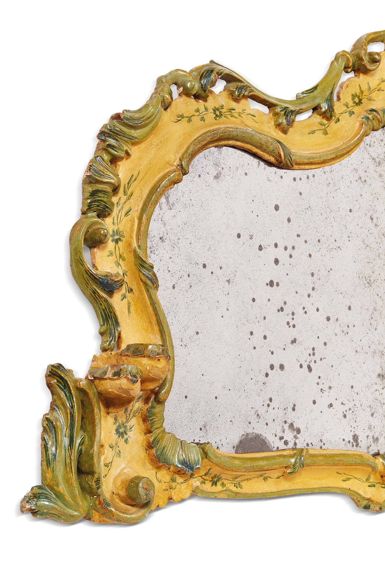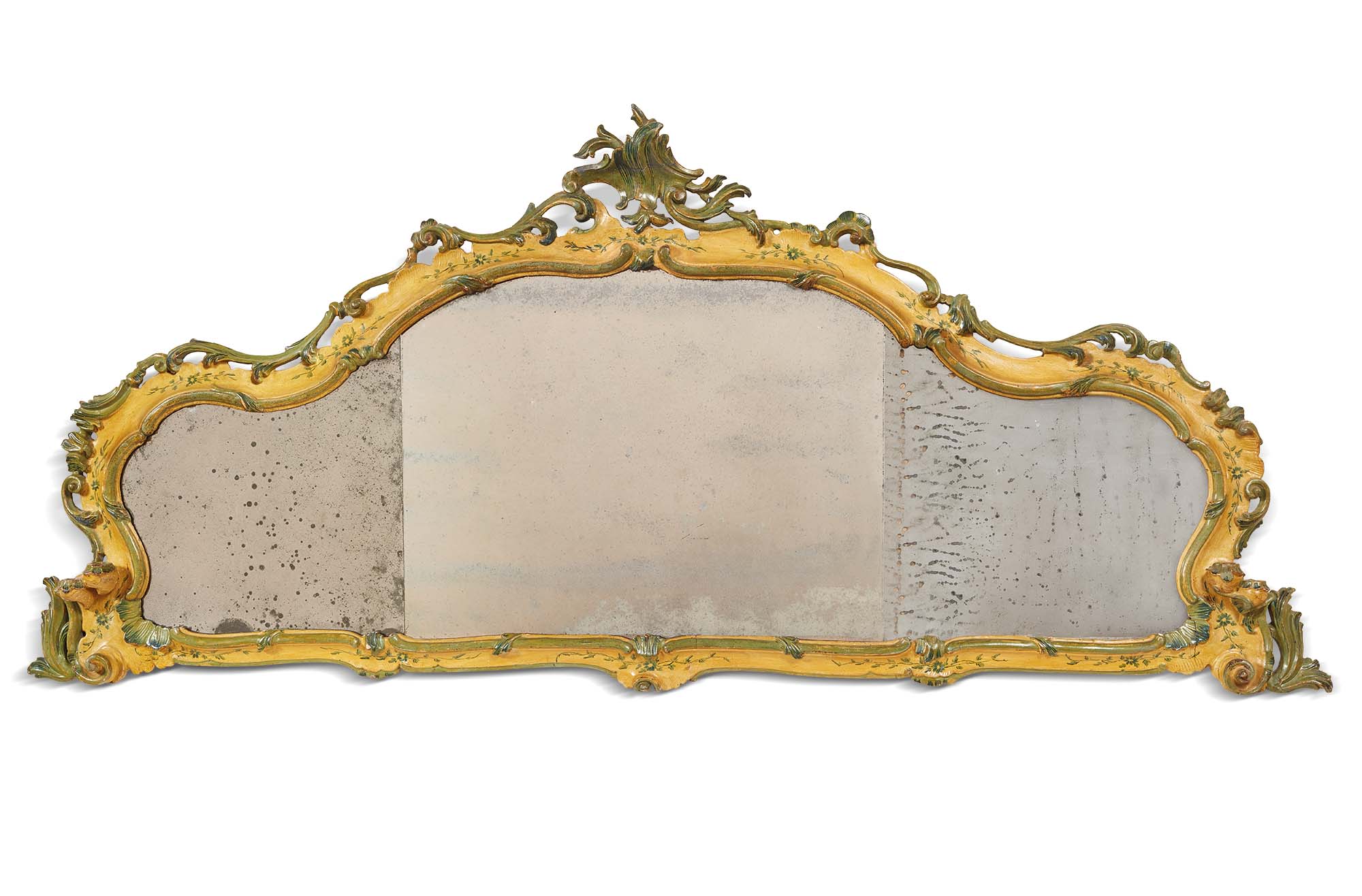 La caminiera in legno intagliato si distingue per una fascia vivacemente sagomata, con profilature verdi e bordi fortemente rilevati e accentuati da intagli a traforo in corrispondenza dell’esterno. Il fondo laccato chiaro ospita una tenue decorazione floreale monocroma. La cimasa è arricchita da un motivo rococò traforato e laccato a fondo verde.
