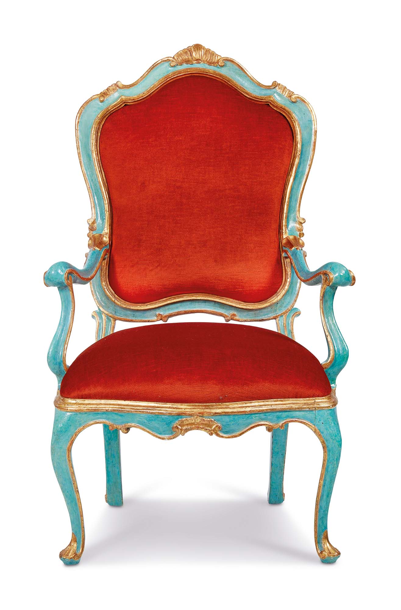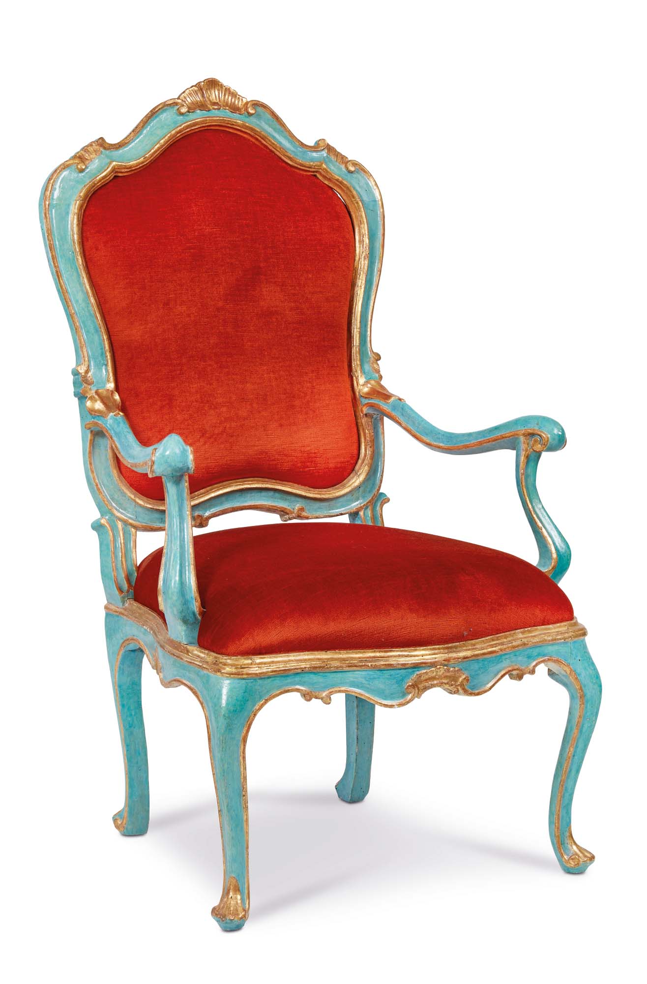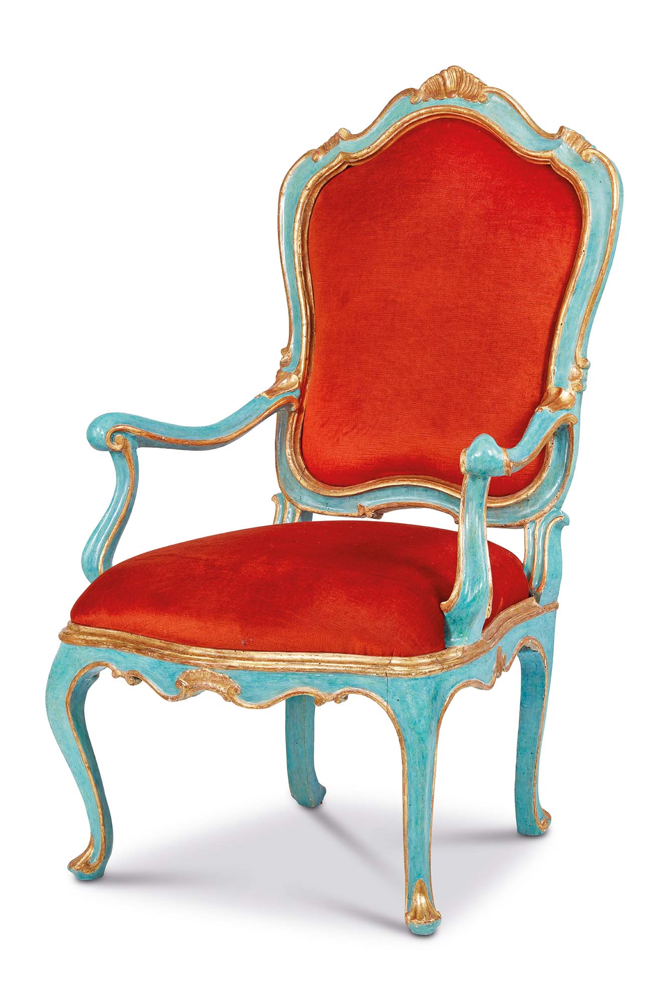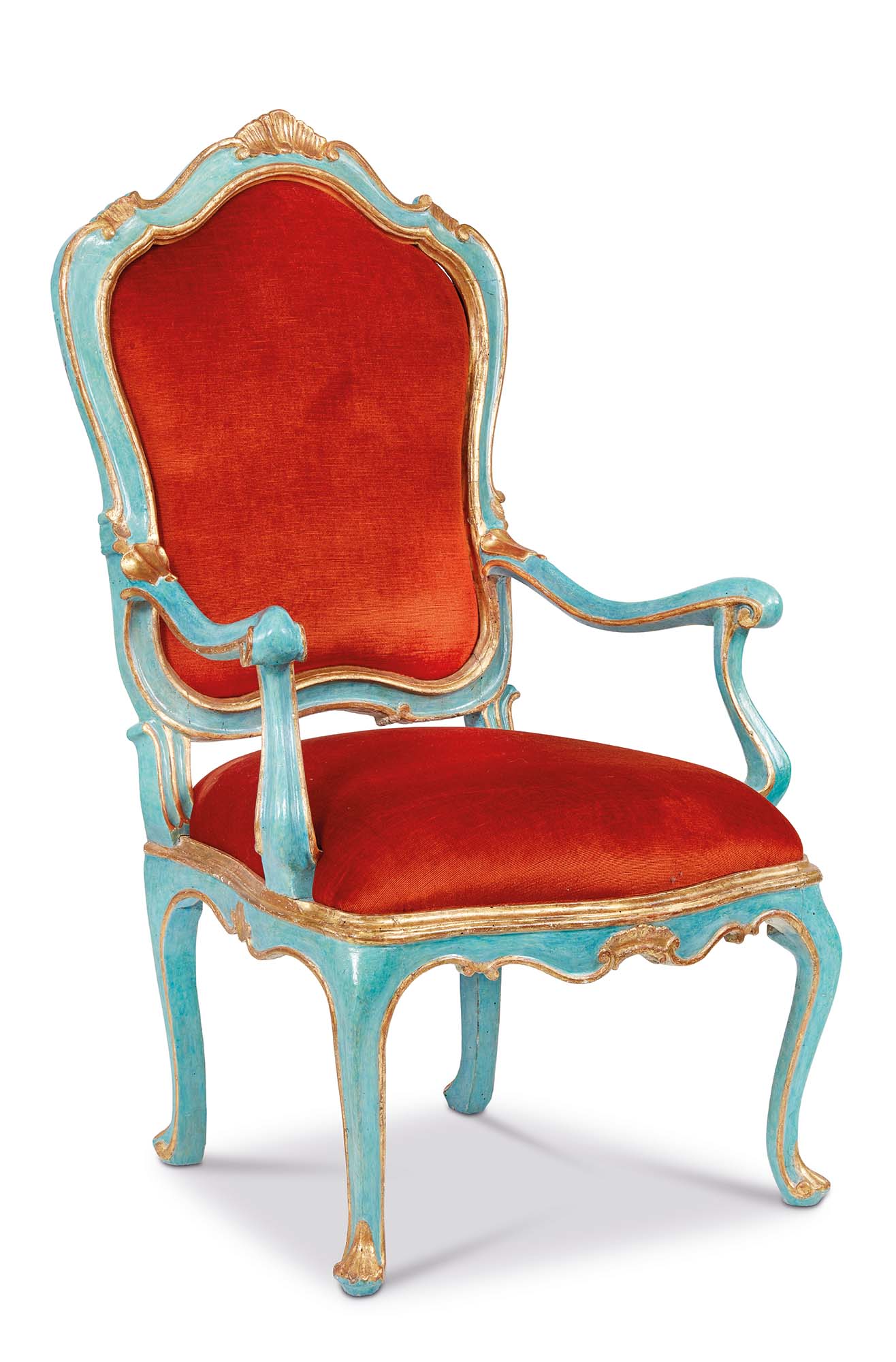 Le quattro poltrone sono descritte da un raffinato intaglio, che addolcisce lo schienale sagomato, al cui vertice troneggia una rocaille dorata, motivo che si ripete al centro della cintura ciondolante. I sostegni en cabriole, con la loro fluida curvatura, terminano con piede ferino. I braccioli, morbidi e sinuosi, si chiudono in delicati riccioli e si raccordano ai montanti flessi. Percorse da una luminosa profilatura dorata, le poltrone vantano un fondo laccato di un celeste intenso e radioso.
