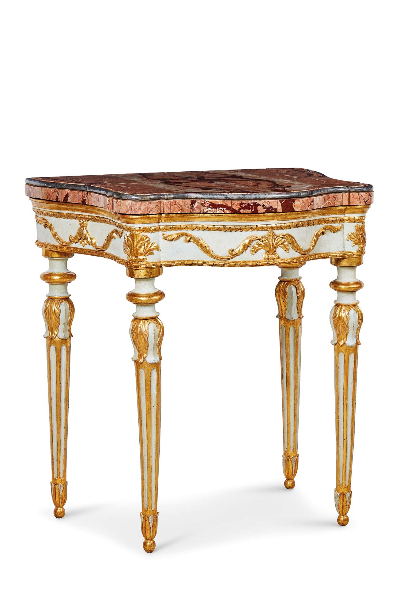 La console, realizzata in legno finemente intagliato, si distingue per le proporzioni raccolte ed armoniche. Il fondo laccato in una delicata tonalità d’azzurro funge da contrappunto alla lucente doratura, la quale esalta il raffinato intaglio di volute fluenti e foglie d’acanto che percorrono i sostegni e la fascia sottopiano, scandita da un movimento mosso. I sostegni, scanalati e già orientati ad una sobrietà neoclassicheggiante, presentano una doppia strozzatura alla sommità e si concludono con puntalini ornati da una foglia d’acanto. Il piano d’appoggio è rivestito da una lastra sagomata di pregiato marmo rosa Fior di Pesco, caratterizzato da una cromia intensa attraversata da venature bianche e trame rosse, incorniciata da un bordo in marmo Grigio di Carrara.