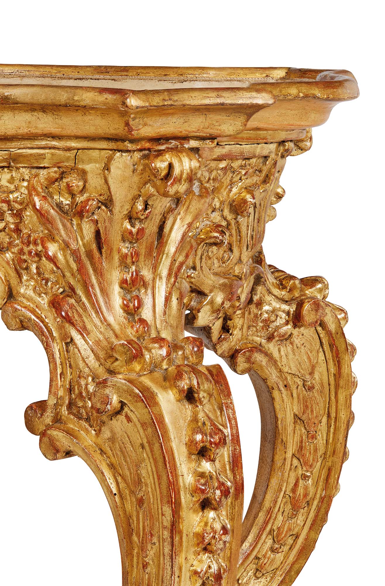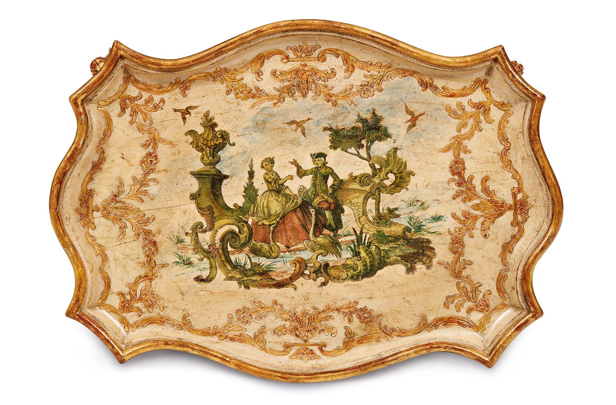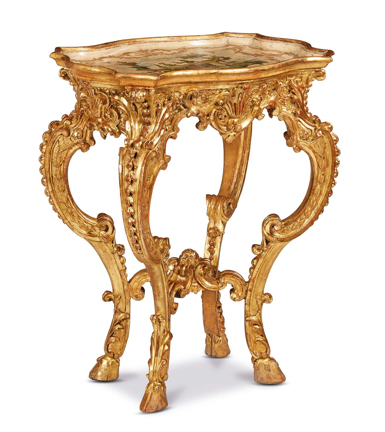 Meraviglioso esempio di ebanisteria barocca piemontese della prima metà del XVIII secolo, il tavolino da centro in legno scolpito e dorato, nato per assolvere la duplice funzione di appoggio e di sofisticato elemento d’arredo di un salottino, si distingue per l’eccelsa qualità esecutiva e per la ricchezza del repertorio ornamentale. I sostegni, di ardito movimento, sono interamente percorsi da motivi decorativi pendenti e si articolano in elaborate volute contrapposte. Raccordati da traverse leggere e fluttuanti che convergono in un pinnacolo centrale, si concludono in zoccoli caprini dalla solida impostazione. Nella fascia, centinata e abbondantemente ornata, si dispongono fitti dettagli floreali intagliati, accompagnati da grandi conchiglie. Il piano, dalla sagoma polilobata e dalla bordatura dorata, presenta il fondo laccato avorio, racchiuso da luminosi racemi fogliati flessuosi e vibranti. Al centro spicca una graziosa scenetta galante realizzata con la tecnica in arte povera, che gli conferisce un tono narrativo e giocoso.