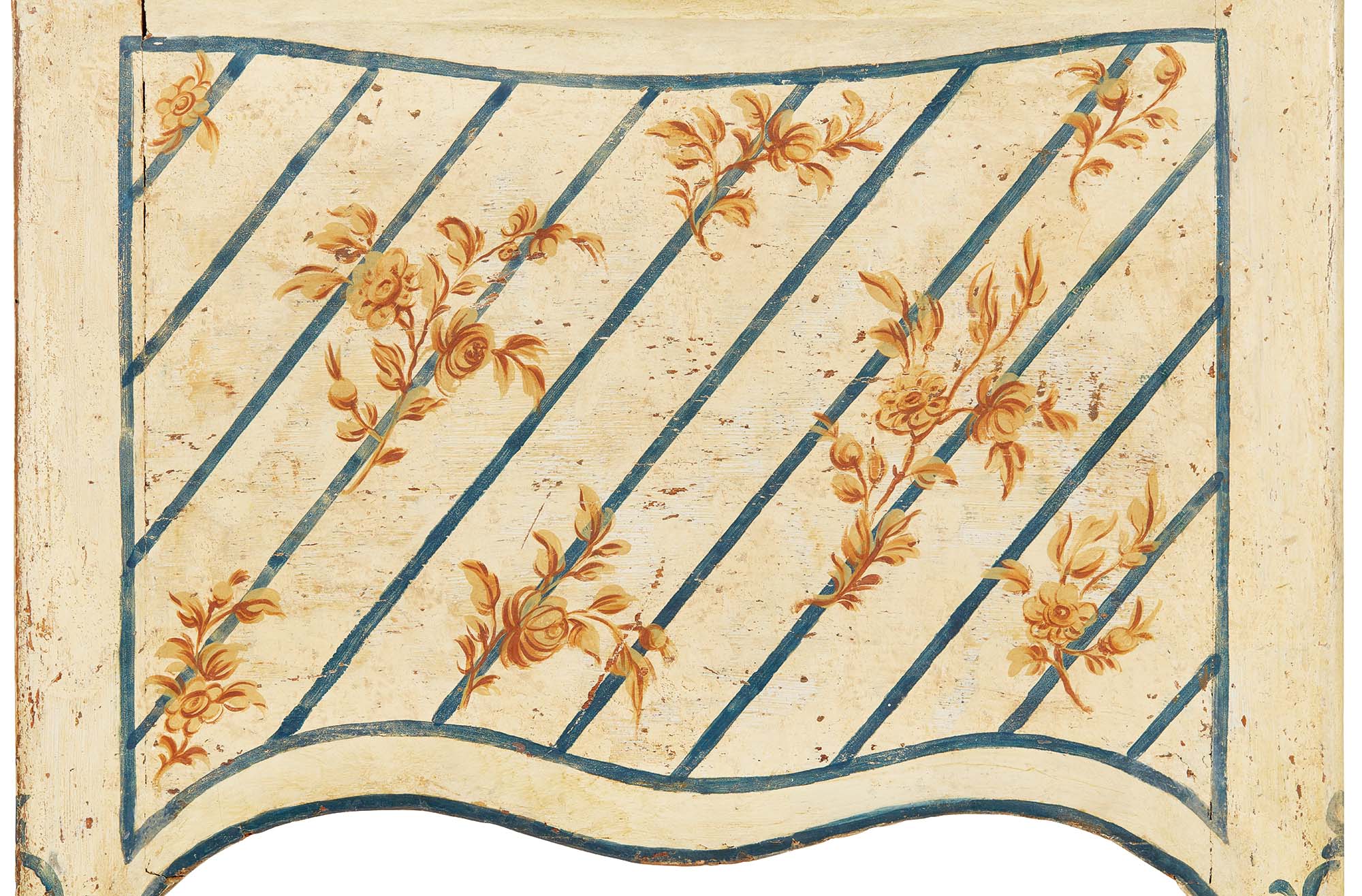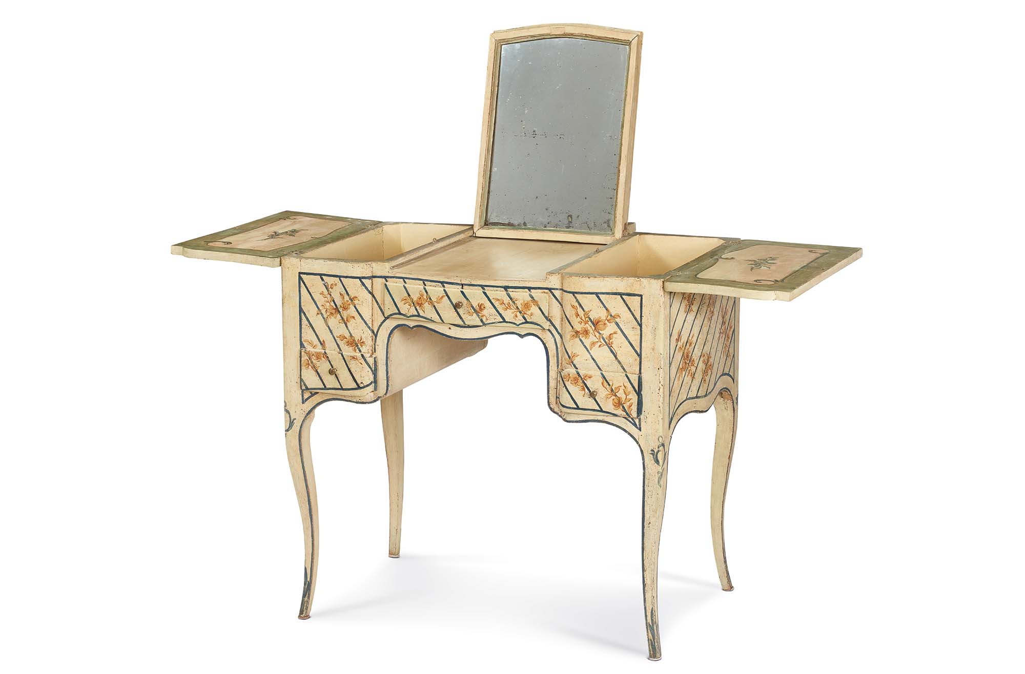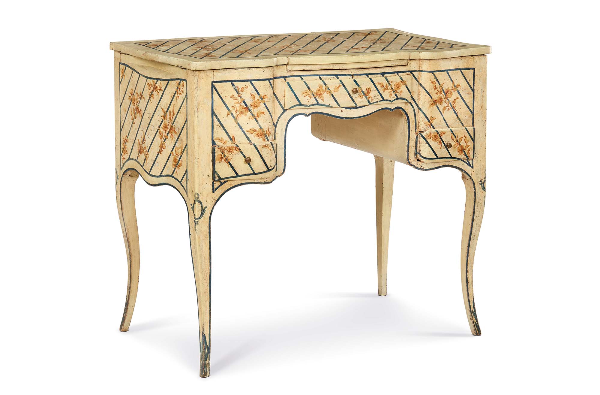 Armoniosa nelle proporzioni, la scrivania toilette si distingue per l’eleganza delle forme sagomate che ne articolano i lati lunghi e i profili curvilinei dei fianchi, sottolineando la sua natura di toilette da centro. La superficie è rivestita da una laccatura color avorio tenue e vellutato. Il motivo ornamentale a righe diagonali blu, di taglio geometrico e preciso, è accompagnato da mazzetti floreali monocromi dipinti in una decorativa nuance sabbia. La fascia accoglie un cassettino centrale, affiancato da due cassetti laterali. Il piano superiore custodisce due vani laterali con apertura a libro, mentre al centro si eleva una piccola alzatina che, aprendosi, rivela uno specchio. La struttura poggia su quattro gambe sinuose a profilo en cabriole.
