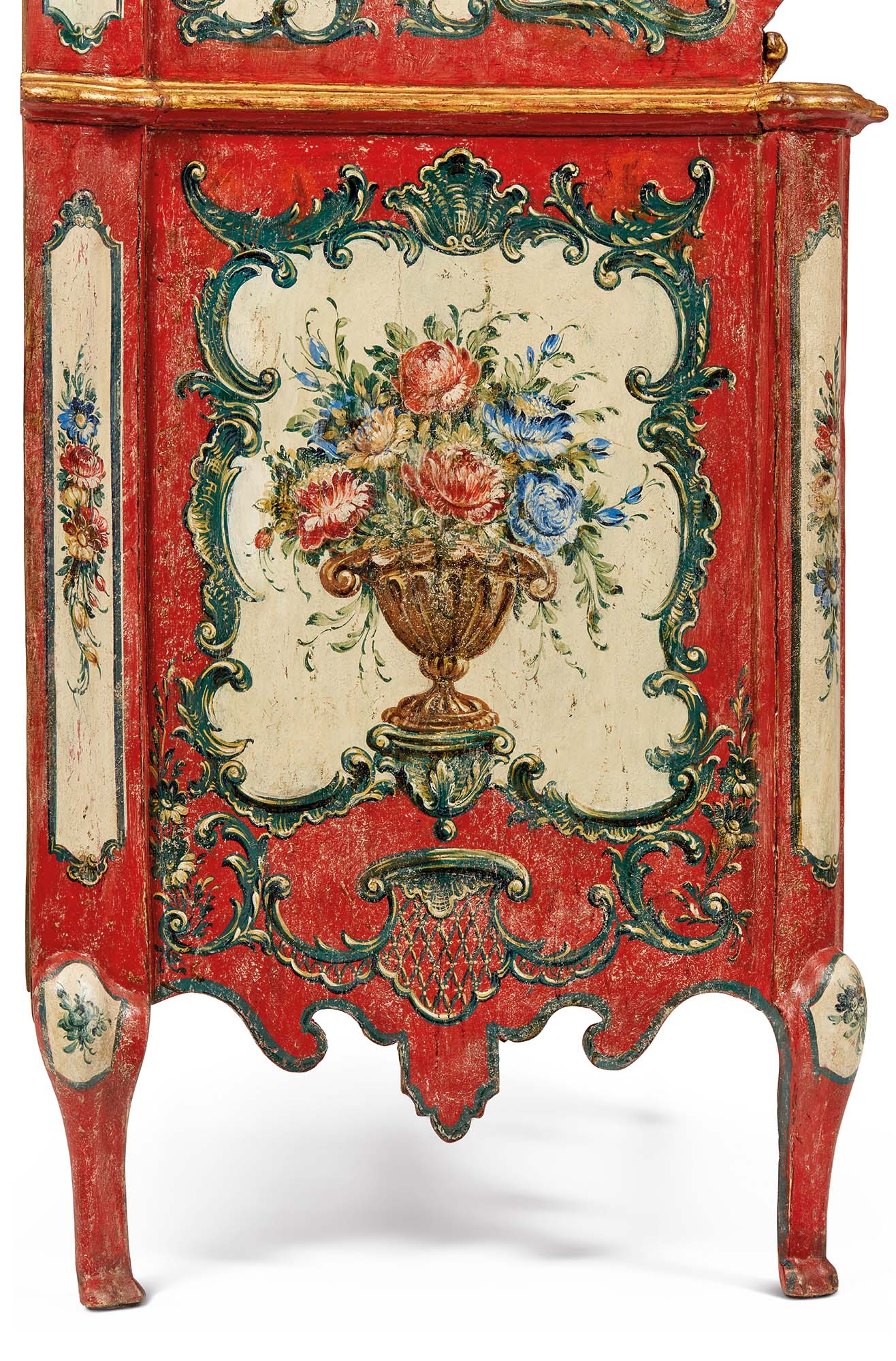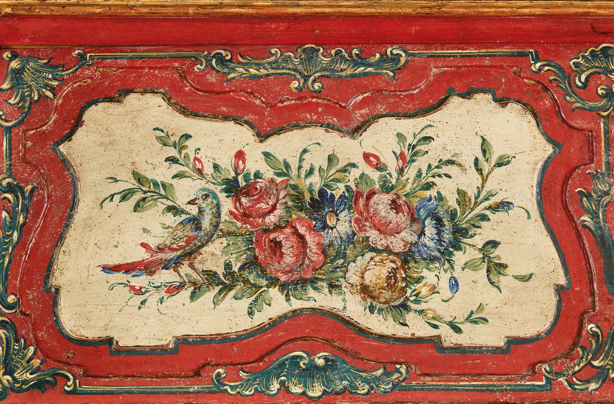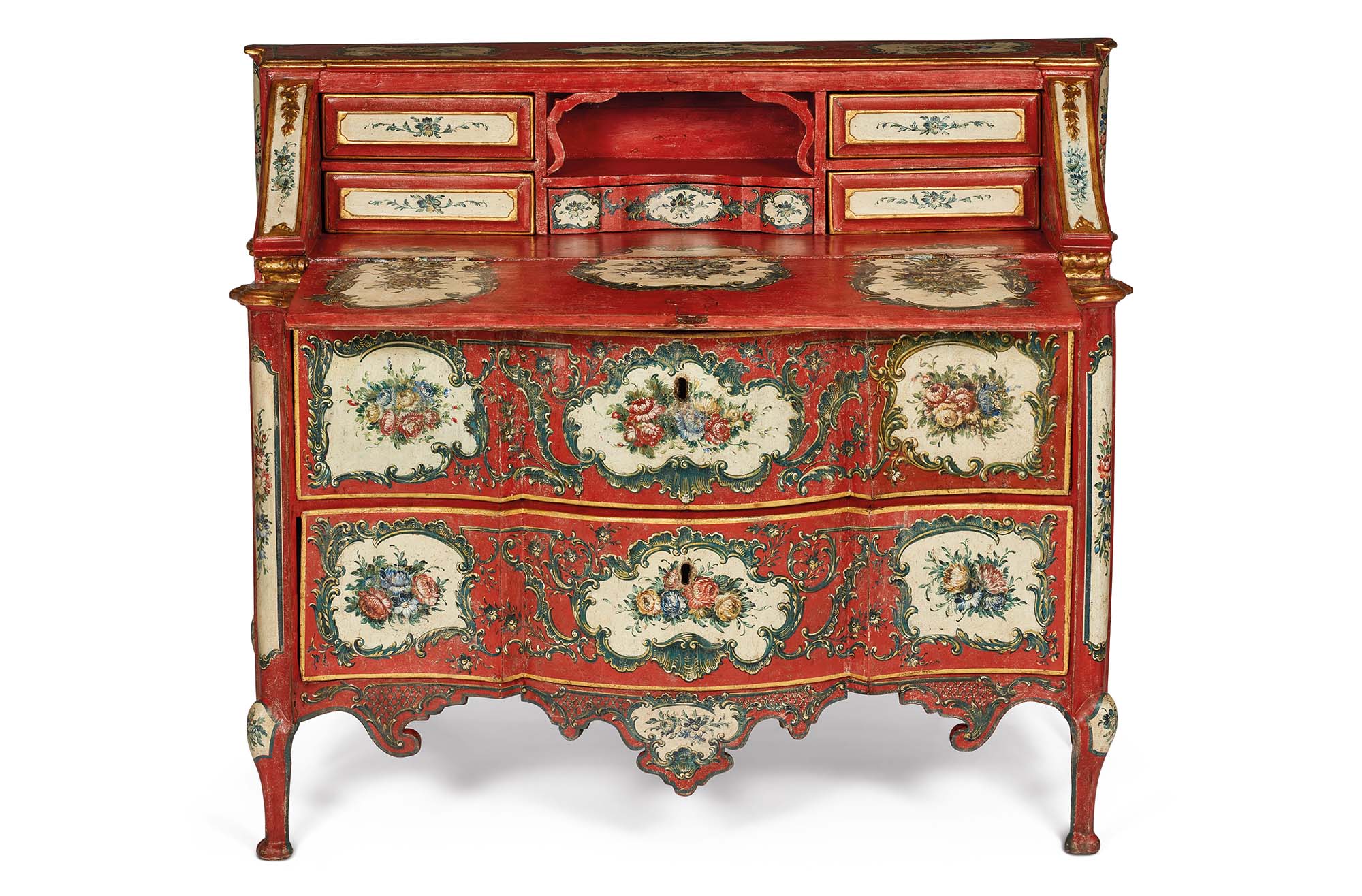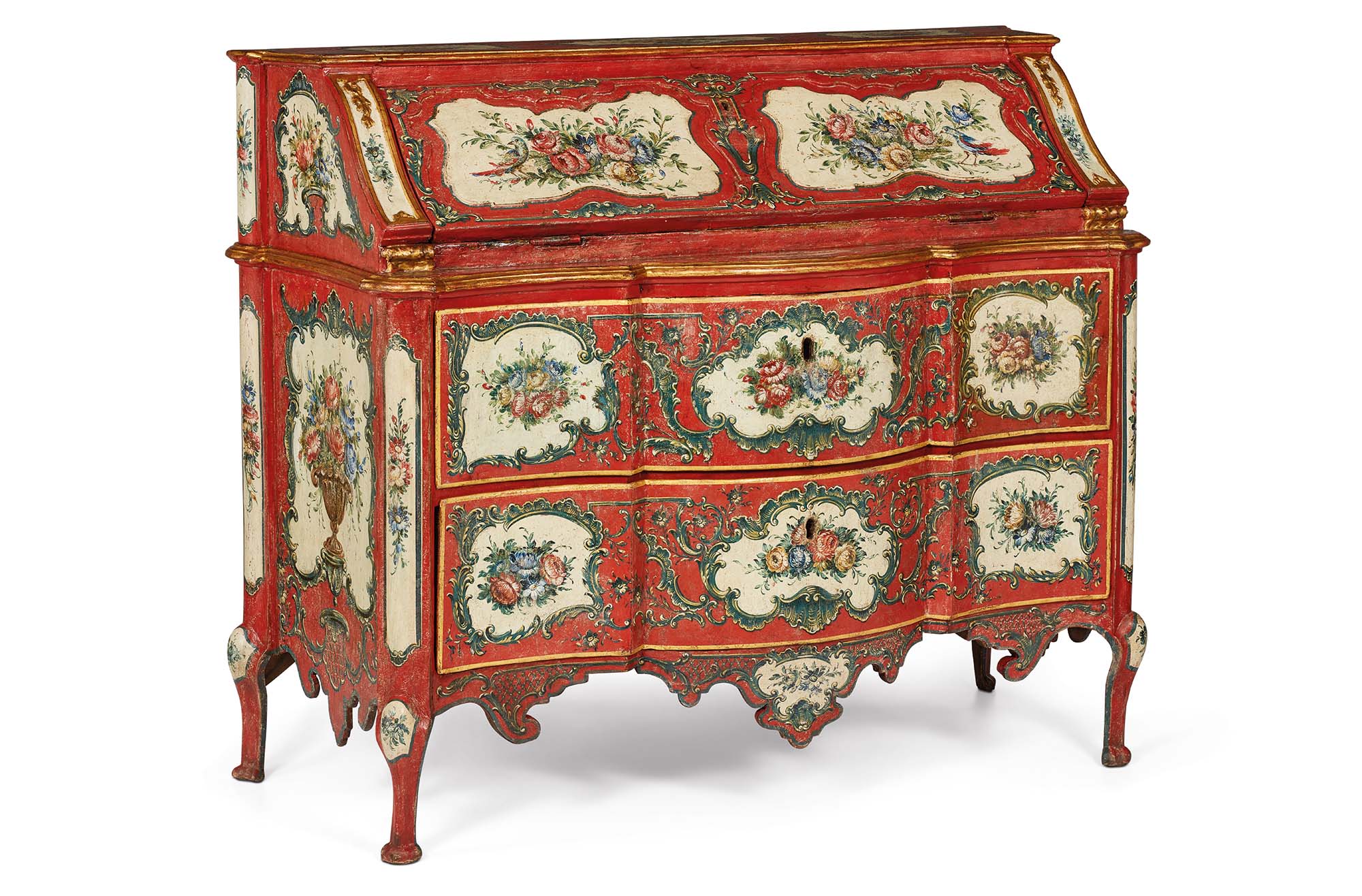 Tra le più affascinanti e opulente espressioni artistiche del XVIII secolo, il Barocchetto siciliano si distingue per un’eleganza che trascende le forme e i decori, infondendo negli arredi un’anima vibrante e sontuosa. Pur derivando direttamente dall’esuberanza del Barocco, questo stile ammorbidisce le linee massicce, prediligendo profili più sinuosi e un’intagliatura più soffice. Il fronte mosso del bureau in legno laccato crea un’onda fluida e dinamica ed è composto da due cassettoni che offrono una generosa capienza, sormontati da una calatoia e da due morbide spalle laterali. L’interno, completamente decorato, si compone di due cassettini per lato e da un vano a giorno centrale con piccolo cassettino sagomato. I fianchi, dalla linea dritta, offrono un piacevole contrasto con la morbidezza della struttura. La cintura è caratterizzata da un medaglione sagomato centrale e si raccorda ai sostegni en cabriole, i quali si concludono in tradizionali piedini ferini. La decorazione, sfarzosa e affascinante, si staglia sul fondo laccato rosso. I riquadri a rocaille, con i loro caratteristici contorni asimmetrici assecondati da racemi curvilinei, ospitano rigogliosi mazzi di fiori policromi e uccellini, dipinti con grande maestria pittorica.