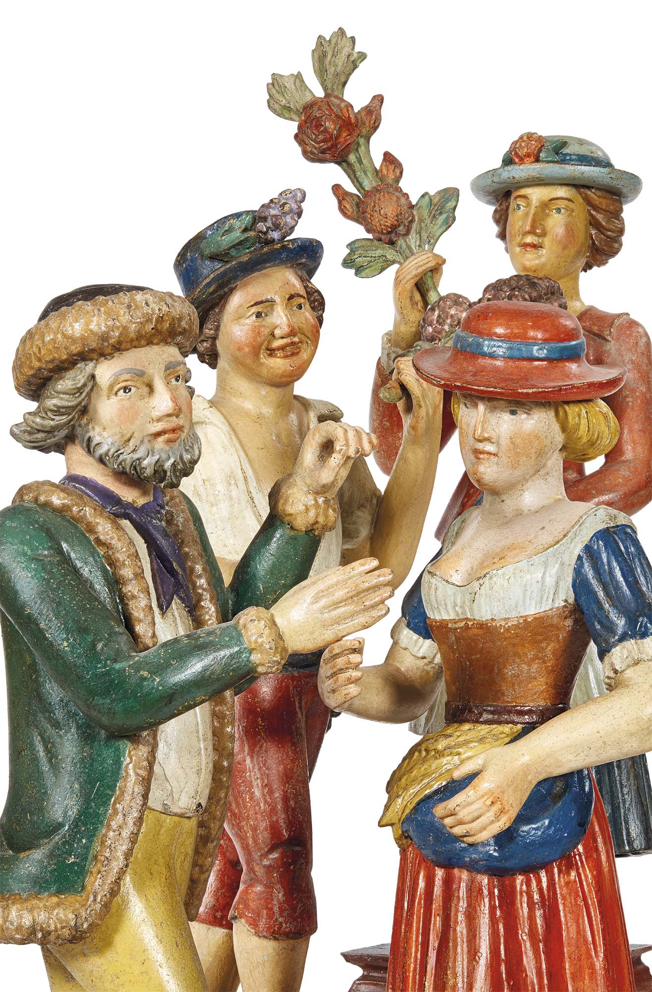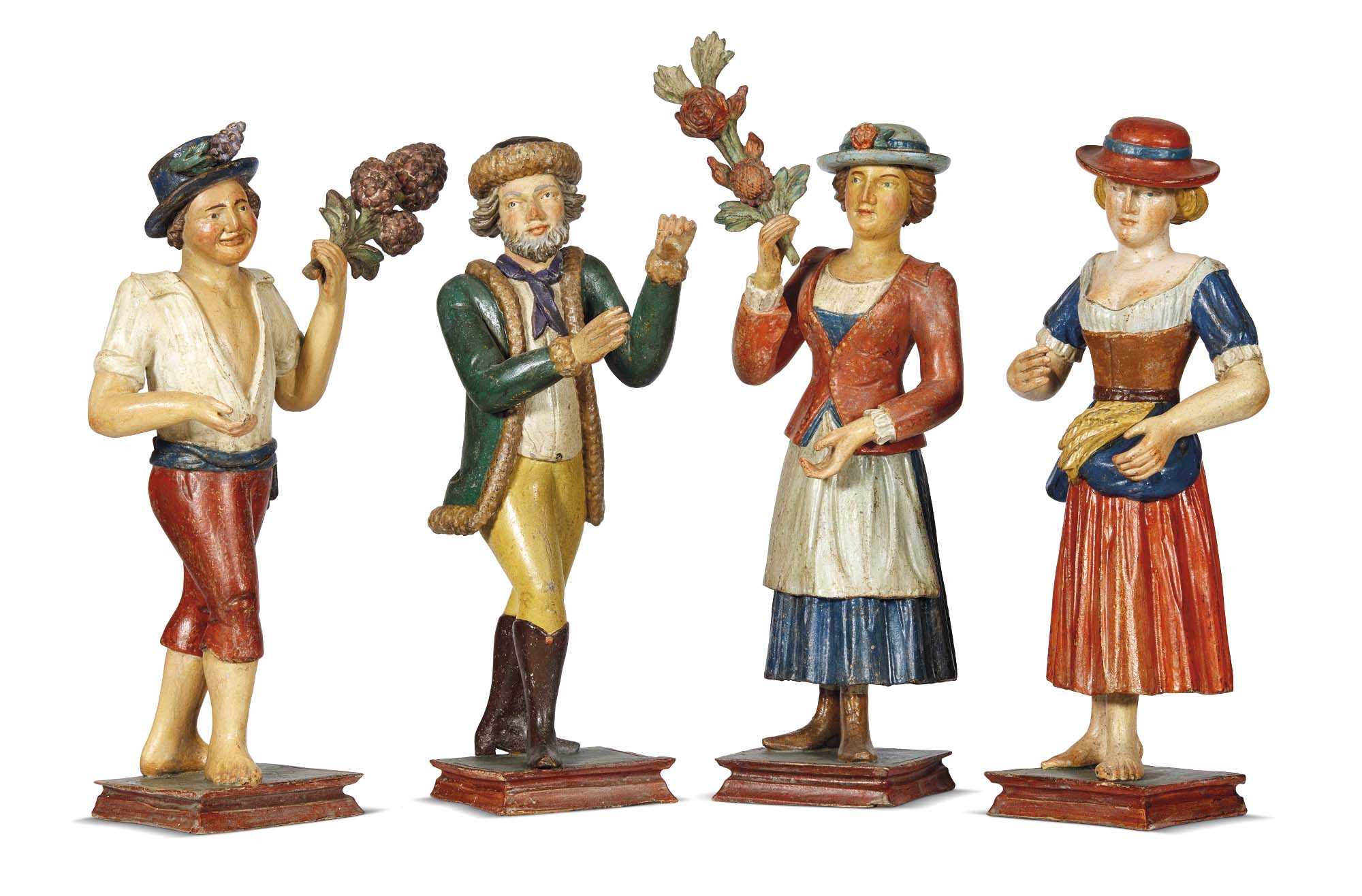 Le sculture lignee dipinte in policromia sono una lieta raffigurazione allegorica del ciclo della natura. La Primavera è una giovane donna radiosa, che simboleggia la rinascita e la freschezza. Il cappellino floreale e gli abiti colorati richiamano la natura rigogliosa ed energica, mentre la spiga fiorita è l’elemento naturale associato alla crescita e alla fertilità. La fanciulla con abiti leggeri e capelli biondi è l’Estate. Porta intorno alla vita una sacca blu, dalla quale travasano le spighe di grano che richiamano la ricchezza dei campi dorati ed evidenziano la sua connessione con la terra abbondante e prospera. Il vecchio canuto incarna l’Inverno, avvolto in abiti pesanti e alti stivali. L’Autunno, a proclamare la fertilità del suo momento, ha un ramo colmo di frutta e i suoi abiti riflettono i colori crepuscolari e ancora caldi della mezza stagione. Le quattro stagioni poggiano su un basamento sagomato.
