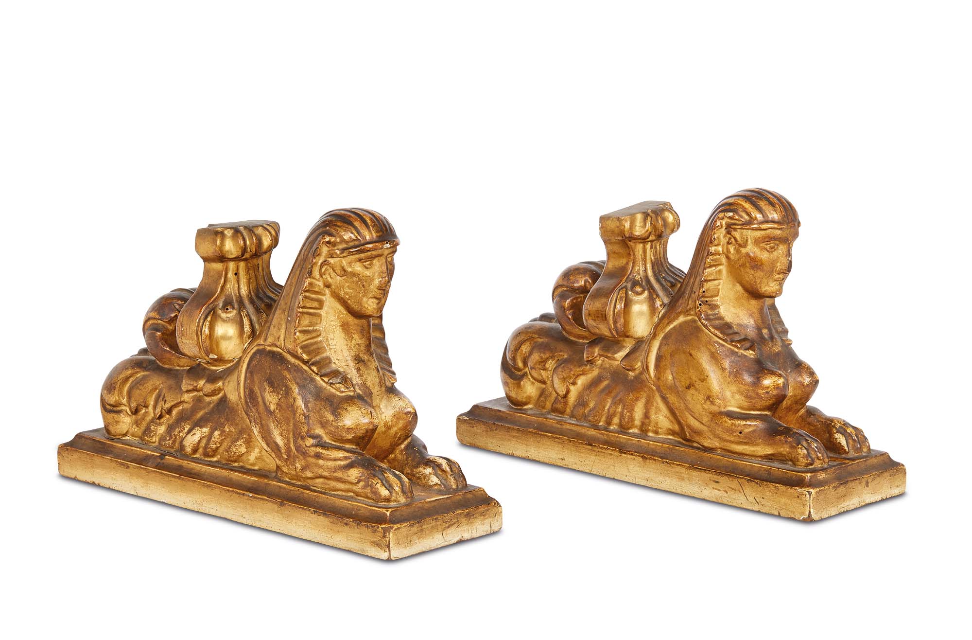 Le figure decorative in legno scolpito e dorato rappresentano una coppia di sfingi, solennemente adagiate su di una base quadrangolare sagomata. La loro natura ibrida si manifesta attraverso un sinuoso corpo leonino di fattura femminea e un volto di ieratica bellezza, emblematico delle rappresentazioni neoclassiche delle sfingi, con tratti sereni e occhi a mandorla appena socchiusi. L’acconciatura che incornicia il viso è scandita da bande laterali in stile egittizzante. Ben oltre il valore ornamentale, la sfinge nei secoli diviene simbolicamente custode del sapere sacro e fonte di protezione, caricandosi nel linguaggio neoclassico di nuove sfumature, per diventare icona della femme fatale intellettuale e enigmatica.