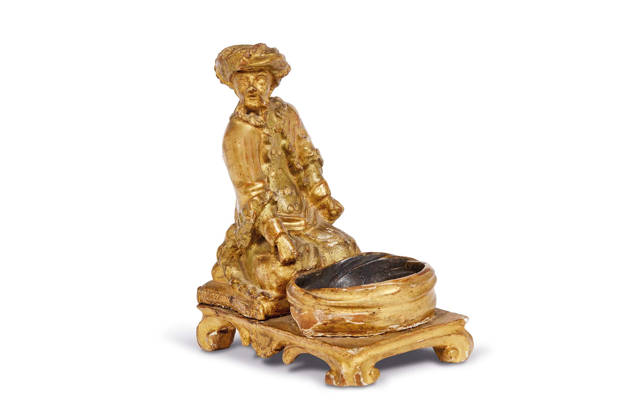 Giocoso e raro esempio di arte decorativa, il portapipa si distingue per la figura inginocchiata su un cuscino, scolpita con finezza in legno dorato. Il personaggio, dalle marcate fattezze orientali, reca un turbante avvolto sul capo, un richiamo all’immaginario esotico ottomano che permea gran parte della produzione decorativa europea del Settecento, insieme alla veste, il cui panneggio è animato da pieghe morbide e fluide. La figura poggia su una base rettangolare modanata, sorretta da piedini sagomati arricciati. Al centro è ricavata una cavità circolare destinata probabilmente ad accogliere l’appoggio per la pipa.