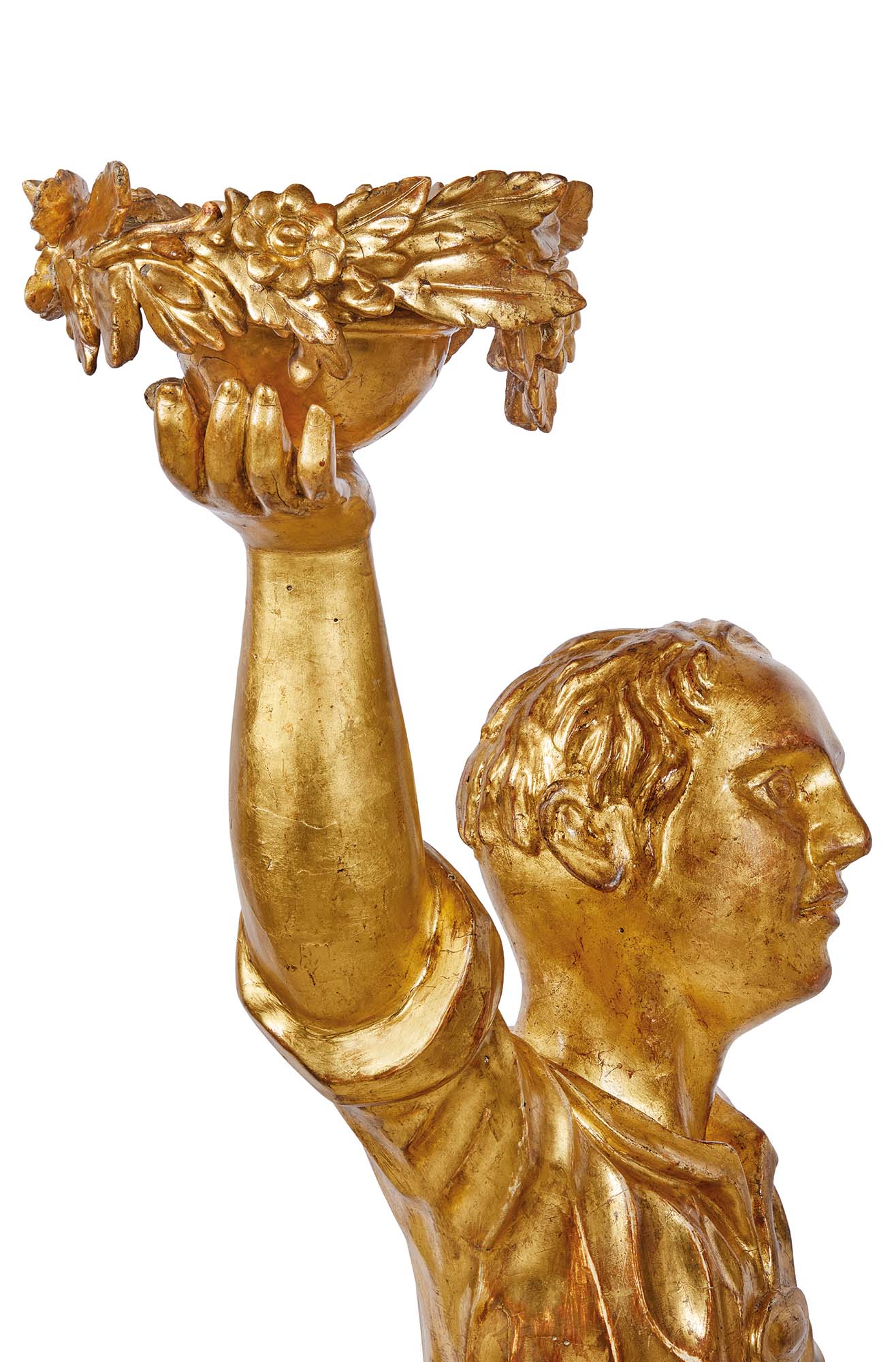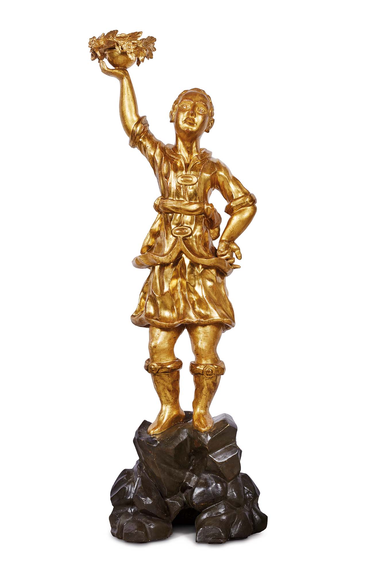 La scultura decorativa, realizzata in legnodorato, raffigura un elegante servitore in posa composta e riverente, con funzione di reggivaso. Stretto in vita da una fusciacca, l’abito che indossa, di pregevole e vivace fattura, sfoggia leggeri drappeggi a balze ed è accompagnato da calzari eleganti e discreti. Il personaggio posa con naturalezza una mano al fianco, mentre con l’altra sorregge una piccola ciotola, ornata da boccioli e foglie d’acanto scolpiti.