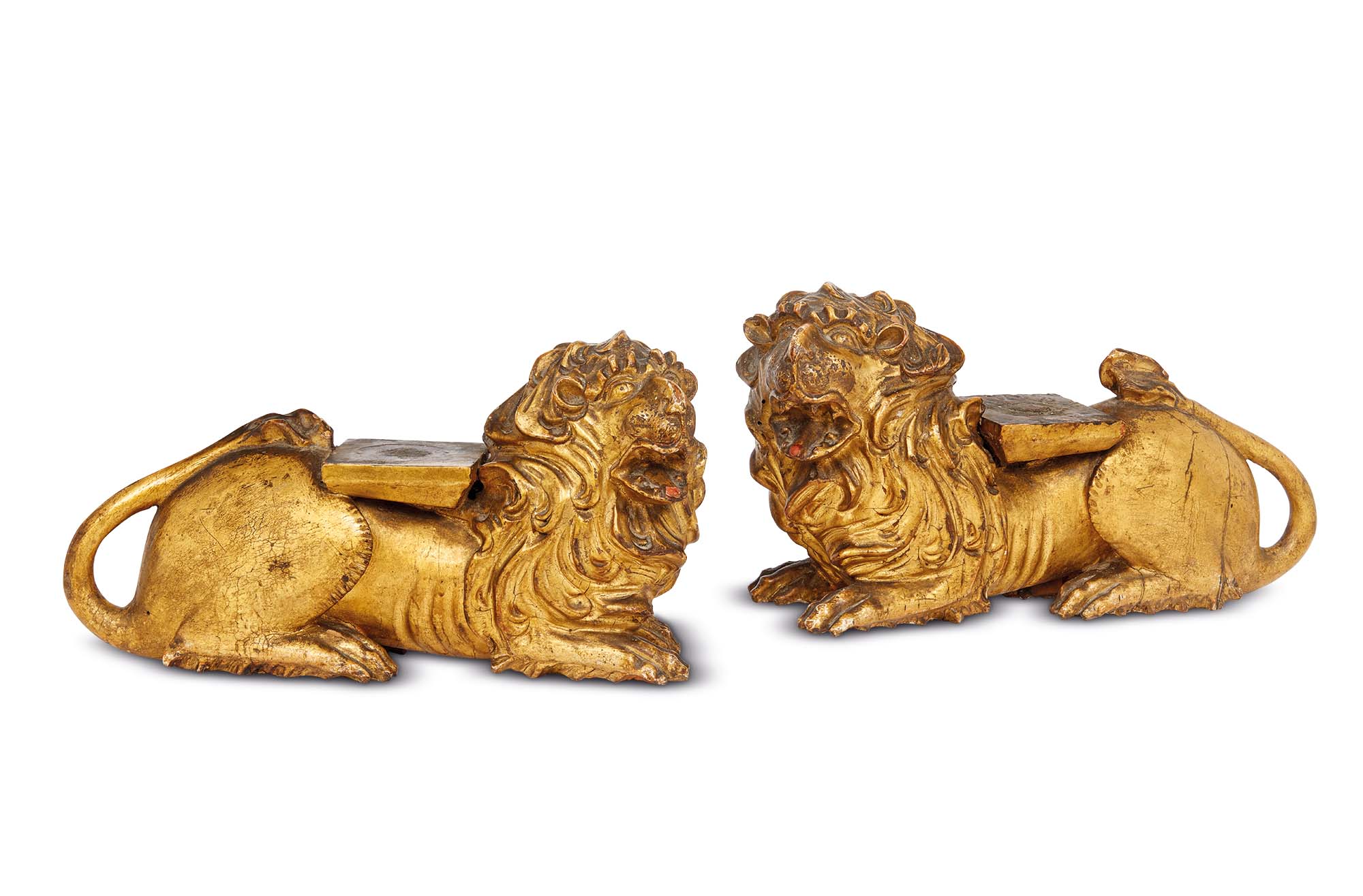 Le decorative sculture lignee dorate rappresentano una coppia di leoni accovacciati, caratterizzati da folte criniere rese con movimento plastico, che si adagiano con fluidità sui corpi vigorosi. La postura raccolta e vigile, insieme alle fauci dischiuse in un ruggito silenzioso, conferiscono alle figure autorità e sovranità. Nel contesto simbolico della Venezia Settecentesca, il leone, ben più diun semplice motivo ornamentale, incarnava il potere spirituale e temporale della Repubblica, nonché la giustizia amministrata con fermezza e sapienza. La sua effige permeava diversi aspetti del linguaggio artistico e politico della città.