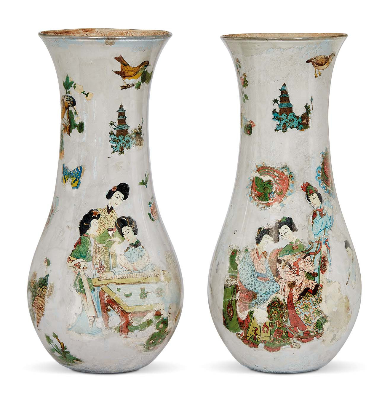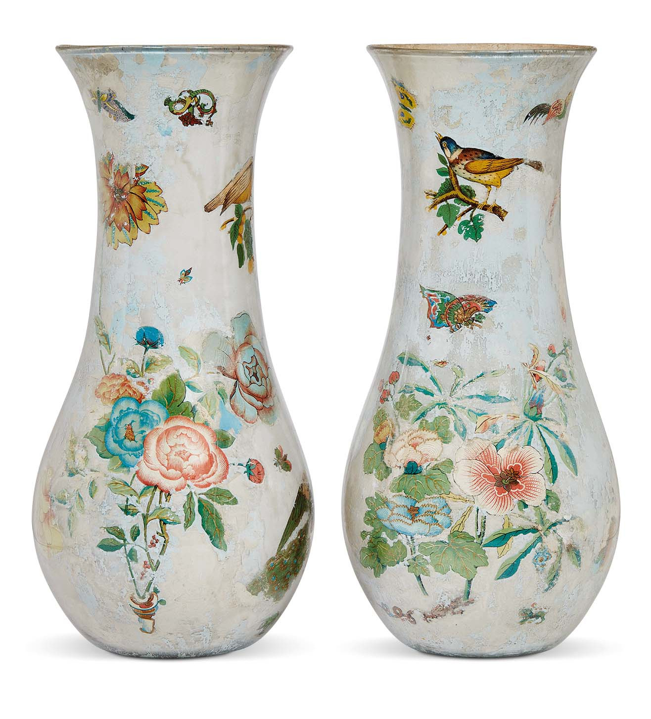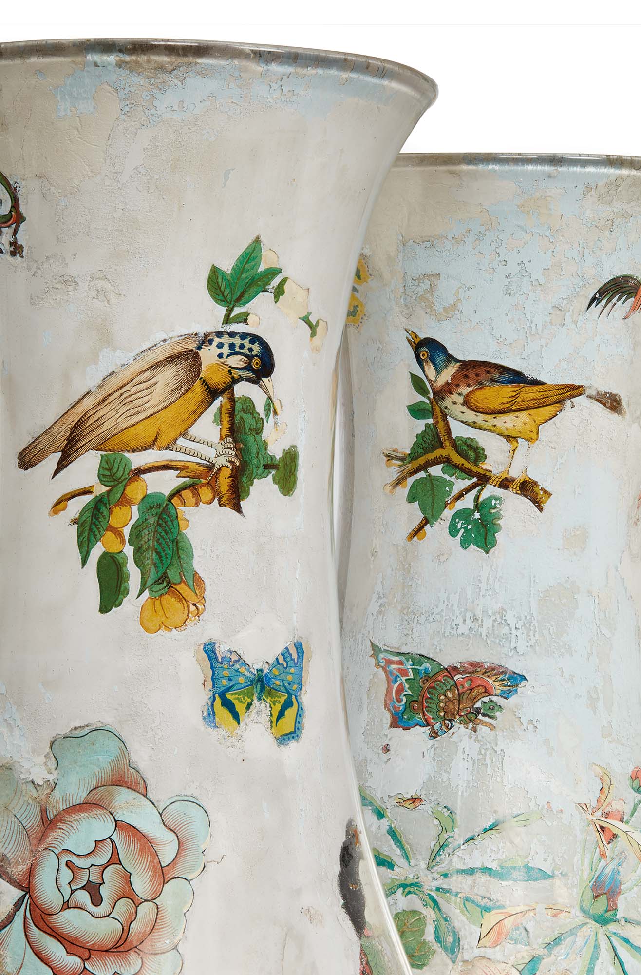 I vasi decorativi, dalla tradizionale forma a tromba, presentano una pancia ampia e sinuosa, un collo stretto che si assottiglia delicatamente e una bocca che si apre in un ampio orlo. La superficiedi vetro, dal fondo neutro, è un tripudio di vivaci e pregevoli decorazioni a cineserie, realizzate con ricchi dettagli mediante la tecnica in arte povera. I motivi raffigurano uccelli dai brillanti piumaggi, farfalle colorate, raffinatissime peonie dai delicati toni, pagode, giardini e grandi figuredi cinesini in abiti tradizionali. La produzione vetraria piemontese del Settecento si specializzò nella decorazione di vasi in vetro dipinto in policromia con applicazioni di figurine a motivi naturalistici e figurativi, che riflettevano la passione per la Cina, fenomeno noto come sino-mania, che influenzò profondamente le arti decorative dell’epoca.