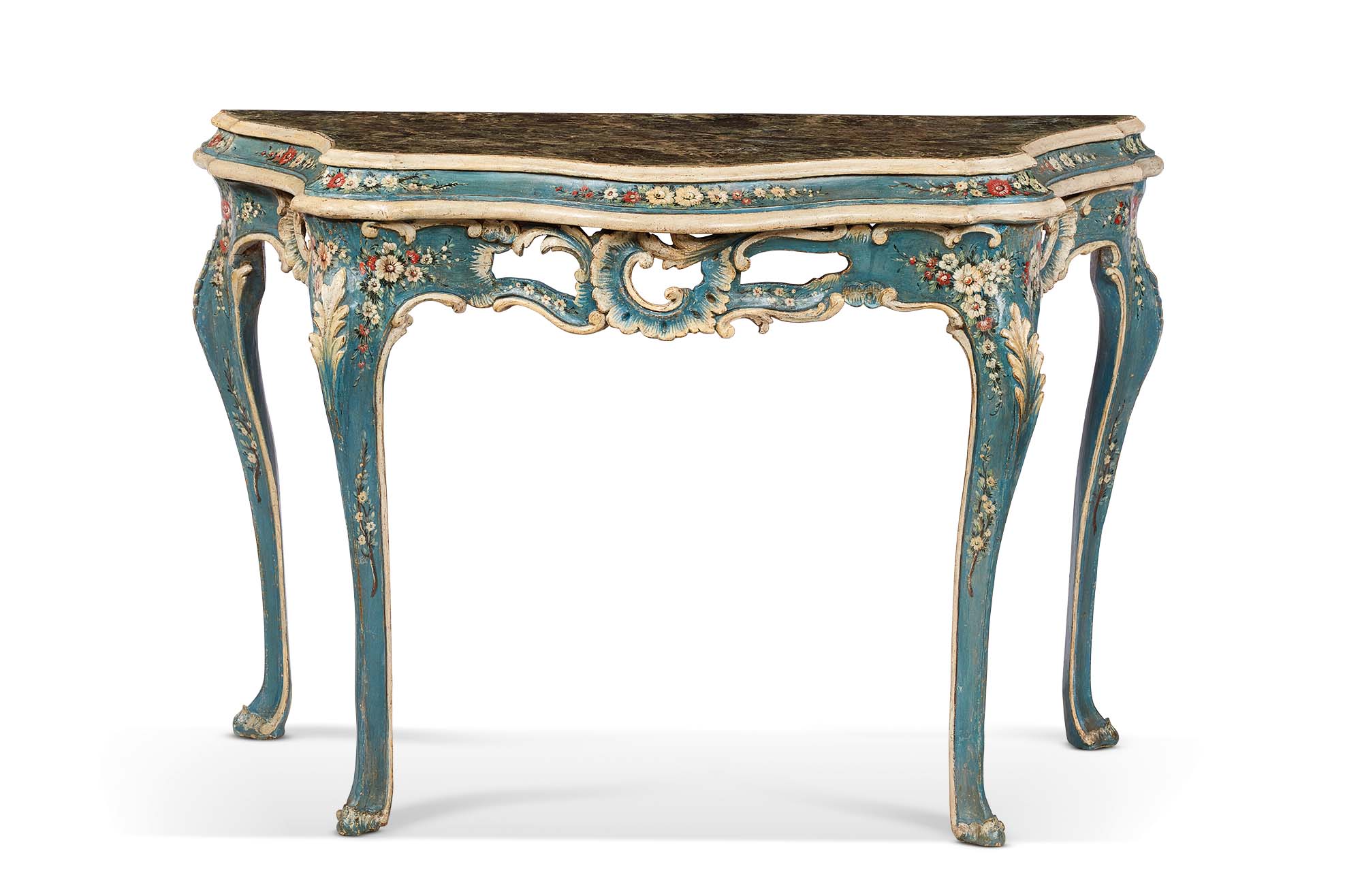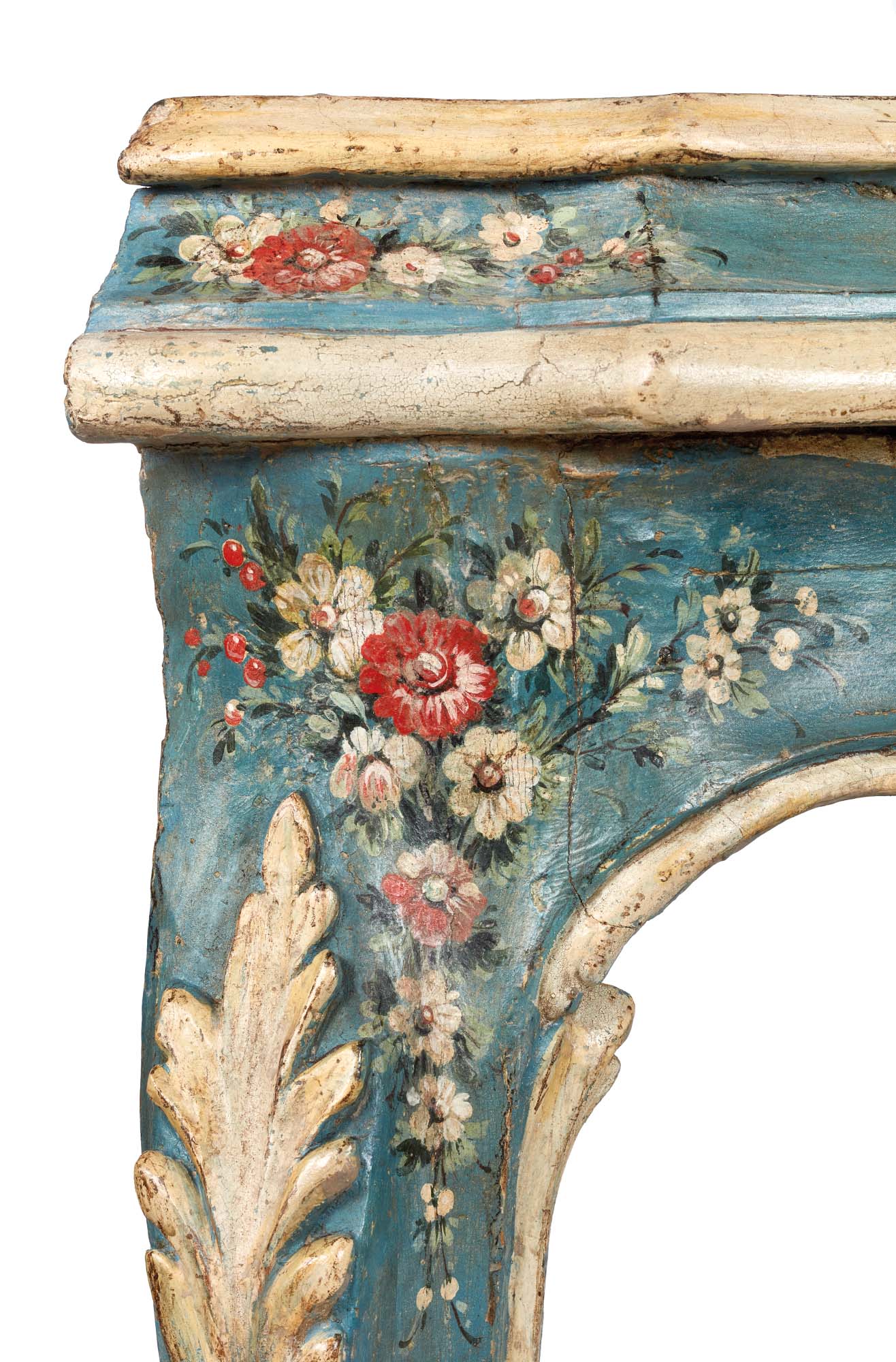 Le sfumature naturali del piano mistilineo, nei toni di un verde intenso, si fondono con fluide e armoniose venature bianche, laccate ad imitazione del pregiato Marmo Verde Alpi. La console in legno intagliato, profilata da una bordura avorio, interseca un magnifico decoro floreale variopinto a deliziosi intagli fogliacei, su un pregevole fondo celeste. Mazzolini di fiori, magistralmente dipinti, ornano la bordura modanata del sottopiano e la frastagliata fascia descritta da eleganti rocailles traforate e pendono dagli eleganti e snelli sostegni en cabriole.