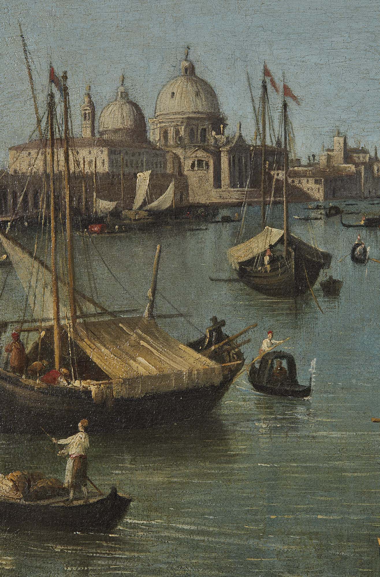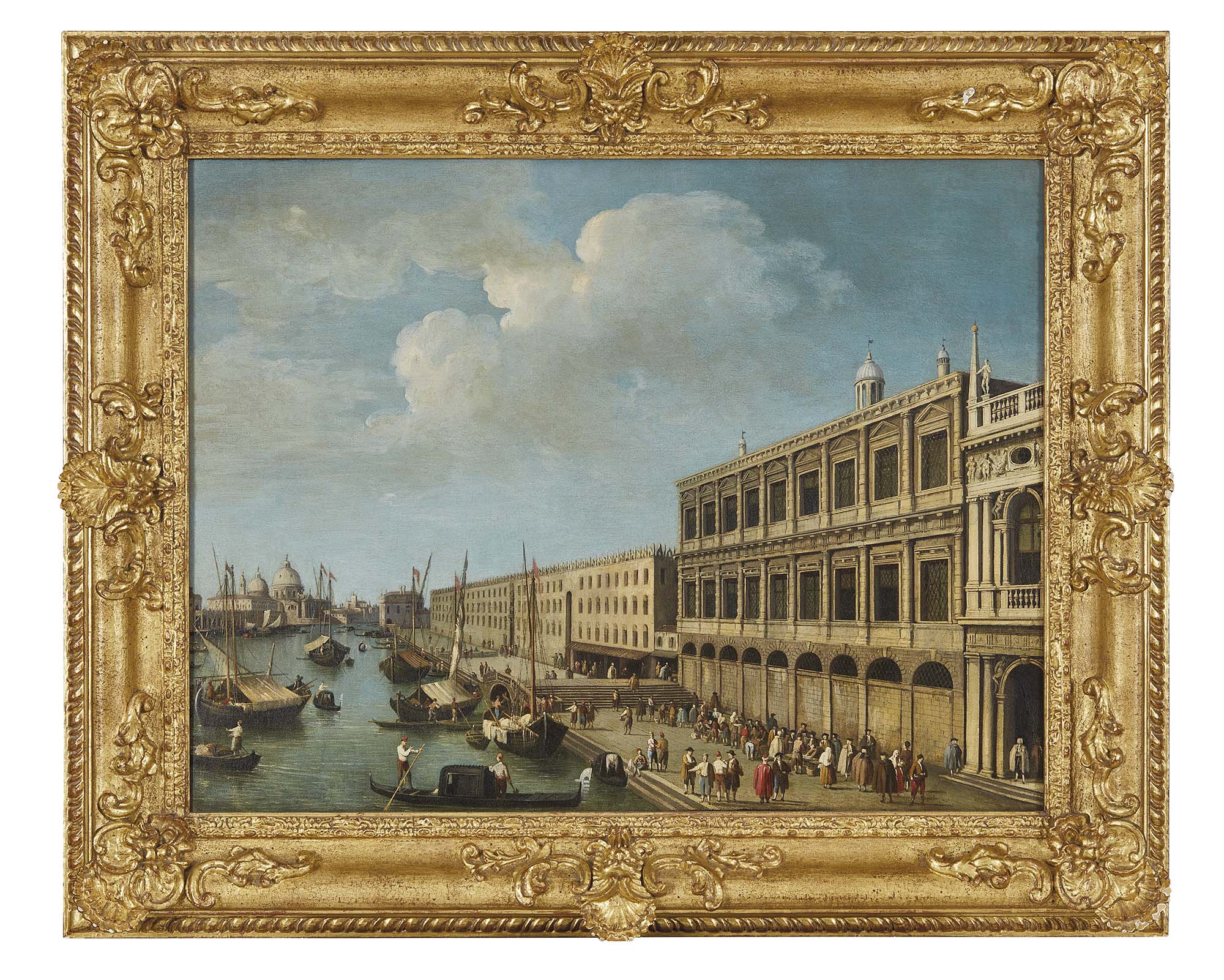 Al valente e meticoloso pennello di Giovanni Battista Cimaroli si deve la splendida veduta, che immortala uno degli scorci più emblematici e celebrati della città lagunare. In primo piano si dispiega il Molo della Piazzetta, mentre sullo sfondo si staglia la Punta della Dogana, dominata dalla celebre Basilica della Salute, capolavoro dell’architetto Baldassarre Longhena, sommo interprete del Barocco veneziano. Sul versante destro della composizione sierge con solenne armonia la facciata della Libreria Marciana, concepita da Jacopo Sansovino su modelli dell’antichità classica romana, nobilitata da una sequenza di statue che si ergono a coronamento del cornicione. Le radici biografiche dell’artista affondano sulle placide sponde del Garda, nella cittadina di Salò. La prima formazione pittorica avvenne presso la bottega del paesaggista Antonio Aureggio a Brescia, che Cimaroli abbandonò nell’agosto del 1711 in favore di Bologna, dove perfezionò la propria arte sotto la guida del celebrato battaglista Antonio Calza, destinato a divenire anche suo cognato. Pur mancando documentazione sui suoi esordi veneziani, è certo che già nel 1722 fosse pienamente inserito nel milieu artistico della città: in quell’anno fu scelto dall’impresario teatrale Owen MacSwiny per affiancare illustri protagonisti del Settecento veneziano - Giambattista Pittoni, Sebastiano e Marco Ricci e il giovane ma già promettente Antonio Canal detto il Canaletto– nella realizzazione del fogliame in quattro composizioni allegoriche dedicate a celebrità britanniche del recente passato. Questo sodalizio professionale fu cruciale, non solo per la risonanza del progetto, ma segnò anche una svolta determinante nella parabola stilistica di Cimaroli, per il profondo influsso esercitato da Canaletto sul suo linguaggio pittorico. Ne assimilò l’impareggiabile luminosità tersa e la purezza atmosferica delle sue vedute, al punto da generare, in alcuni casi, una stupefacente osmosi stilistica che rese le due mani difficilmente distinguibili. Dal 1726 al 1737 Cimaroli risulta iscritto alla Fraglia dei Pittori Veneziani, e proprio negli anni Trenta del Settecento si apre una nuova, feconda stagione della sua attività artistica, segnata da una produzione copiosa ed apprezzata. Veneziano d’adozione, Cimaroli conquistò il gusto di un pubblico internazionale grazie ai suoi brani campestri e paesaggi veneti - che recano la chiarissima impronta di Francesco Zuccarelli- e le vedute veneziane, interpretate con uno sguardo sensibile e fortemente influenzato dal modello offerto dall’illustre Canaletto, proficuo serbatoio di temi e suggestioni. Il Molo verso la Basilica della Salute, con la sua tavolozza sobria, le tipiche e inconfondibili macchiette e la pacata descrizione degli elementi architettonici sotto un cielo ricco di nubi cumuliformi, rappresenta una testimonianza eloquente della sua poetica. Essa si configura come un documento visivo di rara efficacia, una sorta di cronaca pittorica del quotidiano veneziano, descritta con acume e straordinaria resa luministica. L’atmosfera che si respira è limpida e l’accuratezza dei dettagli architettonici rivela una maturità stilistica compiuta, in cui lo sguardo dell’artista si rivolge con pari sensibilità al contesto ambientale e alla struttura scenica. La solidità dell’impianto compositivo e il nitore pittorico permettono infatti di datare l’opera intorno al 1740. L’eccellenza qualitativa della sua produzione lo proiettò al centro della scena collezionistica veneziana, suscitando l’interesse di mecenati d’eccellenza, come Zaccaria Sagredo, il console britannico Joseph Smith e il maresciallo Von der Schulemberg. Nei libridi casa del condottiero tedesco figurano due vedute di Venezia acquistate nel 1736, preziosa testimonianza del segmento vedutista della sua attività. Se la produzione paesaggistica di Cimaroli, più prolifica, si sviluppò intorno a un repertorio di temi arcadici, punteggiati talvolta da rovine classiche o deliziosi borghi lungo la Riviera del Brenta, le vedute veneziane costituiscono una sezione assai più rara e ricercata del suo catalogo. Proprio per questo, il dipinto assume un valore emblematico, che ne fa una manifestazione esemplare, da porre in relazione con altre opere analoghe, come la Veduta del Canal Grande con la chiesa della Carità della Hunterian Collection dell’Università di Glasgow e la spettacolare Caccia dei tori in piazza San Marco, un tempo nella collezione di Francis Watson a Londra, ritenuta frutto di una collaborazione diretta con Canaletto.