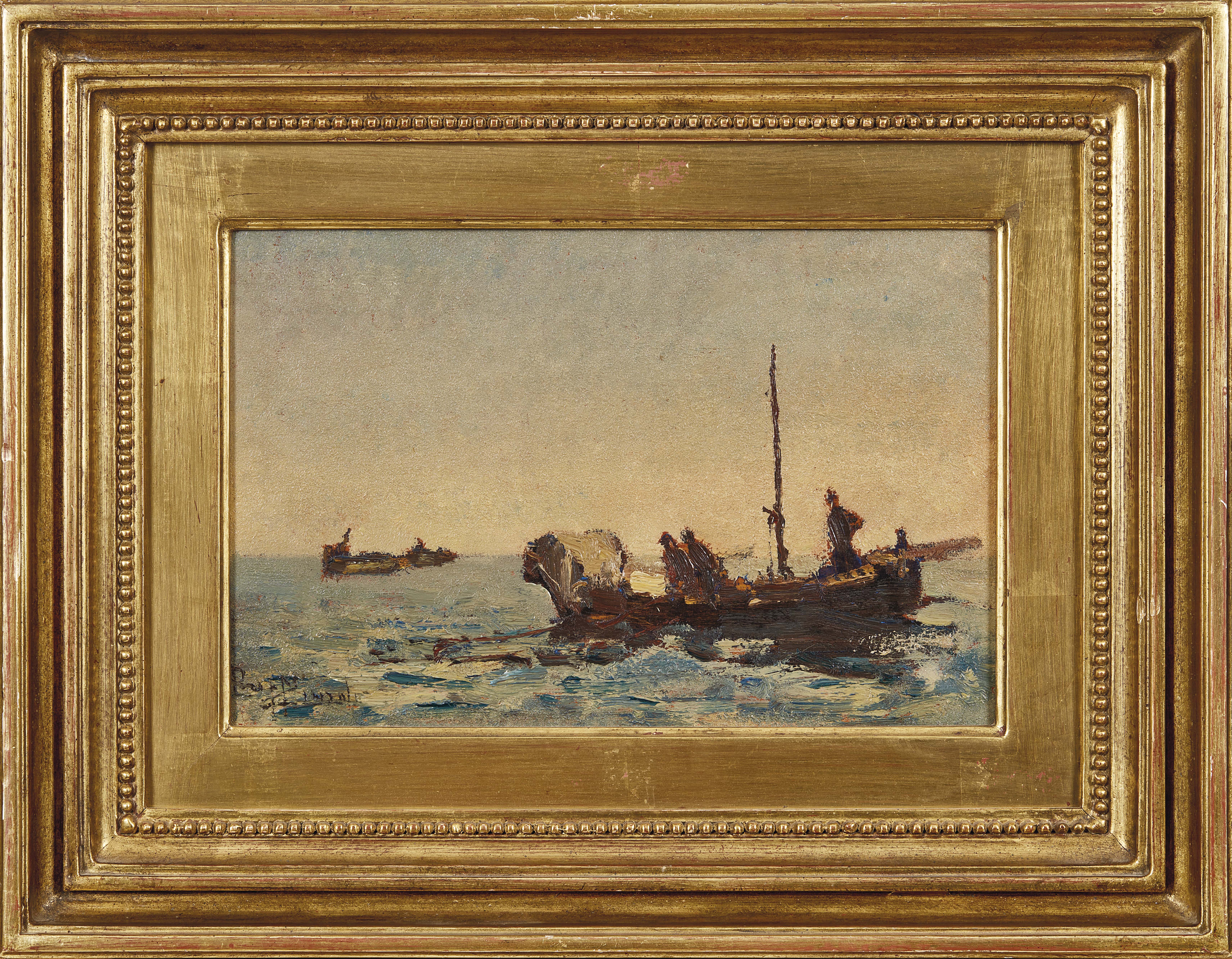 Nella prima metà di questo decennio Beppe dipinge imbarcazioni che veleggiano nella laguna – le cosiddette “vele” – come quest’opera Barche in laguna. Egli le osserva e le ripropone in diverse varianti, mutando la loro direzione, cambiando l’atmosfera o modificando i dettagli del paesaggio. La luce è l’indiscussa protagonista di queste opere e Beppe lavora sempre en plein air, per non farsi sfuggire la breve durata degli effetti naturali. In questi paesaggi lagunari la pennellata si spezza in veloci appoggi di colore; il mare è realizzato con rapidi tocchi orizzontali accostati, che diventano guizzanti e appuntiti con l’incresparsi dell’acqua; il cielo è un omogeneo e vibrante tessuto di colore. La stesura irregolare e al contempo omogenea del colore svela l’uso di un pennello appositamente consumato, per creare un inedito effetto spugna nella descrizione del cielo.